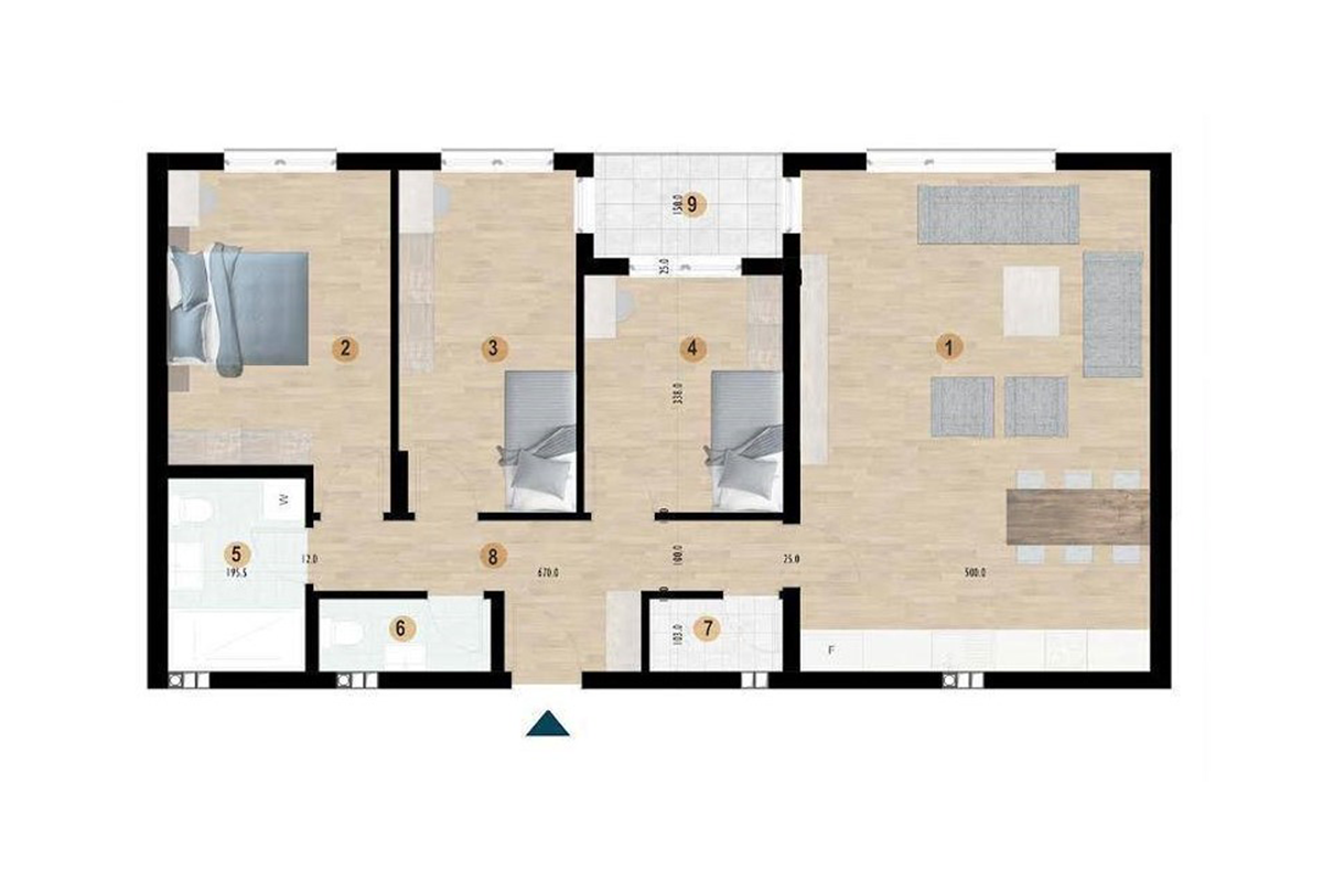 Banesa ka orientim nga perëndimi dhe veriu dhe ka këtë renditje të hapësirave të brendshme: qëndrim ditor, kuzhinë, tri dhoma të gjumit, banjo, tualet, depo dhe ballkon.