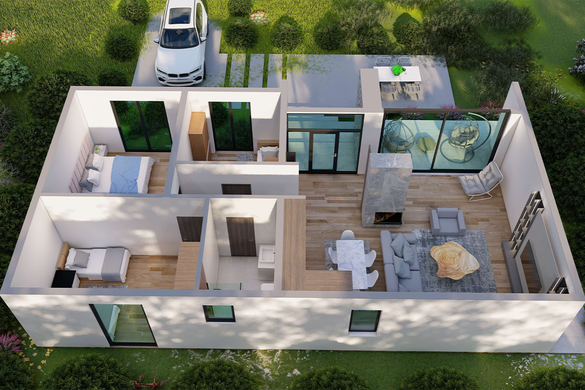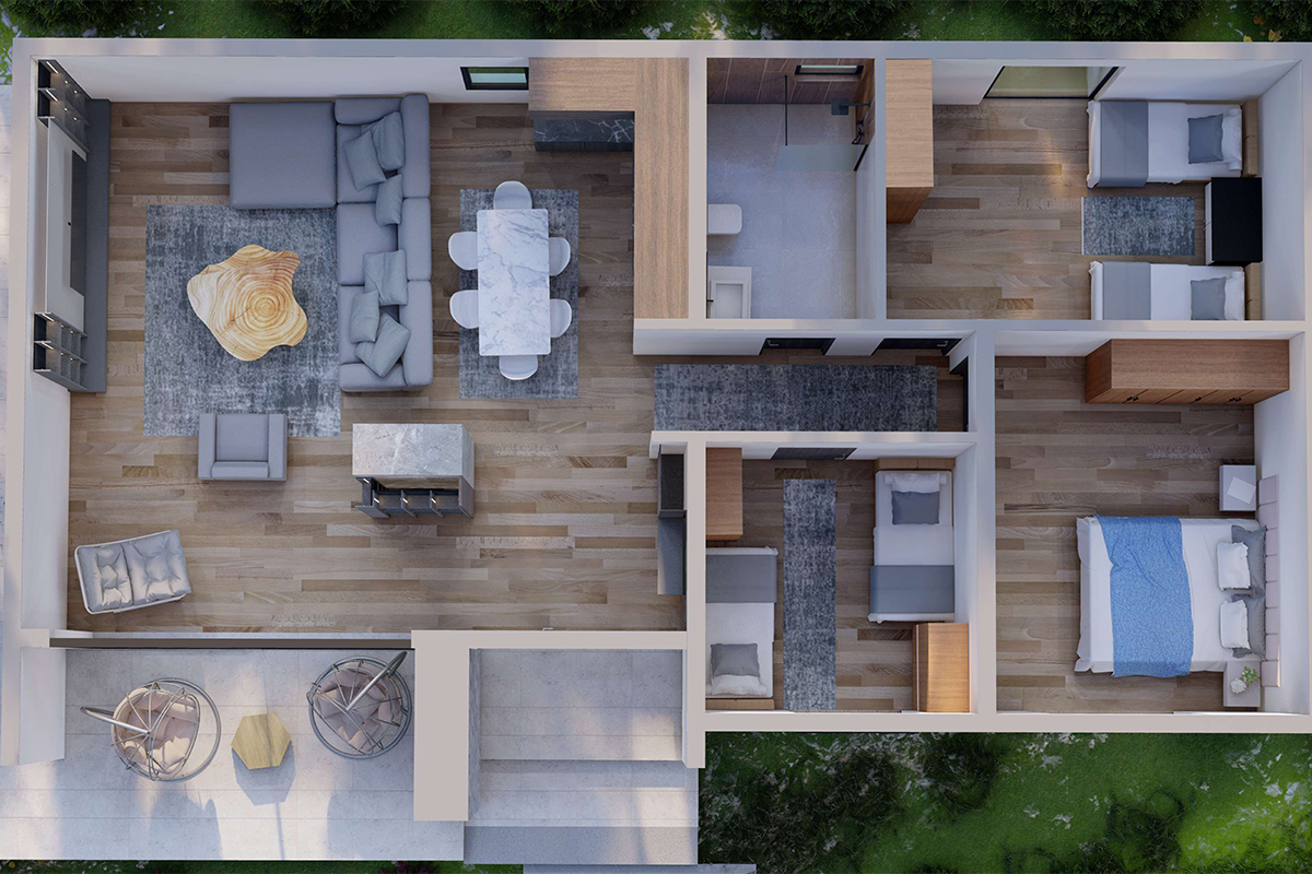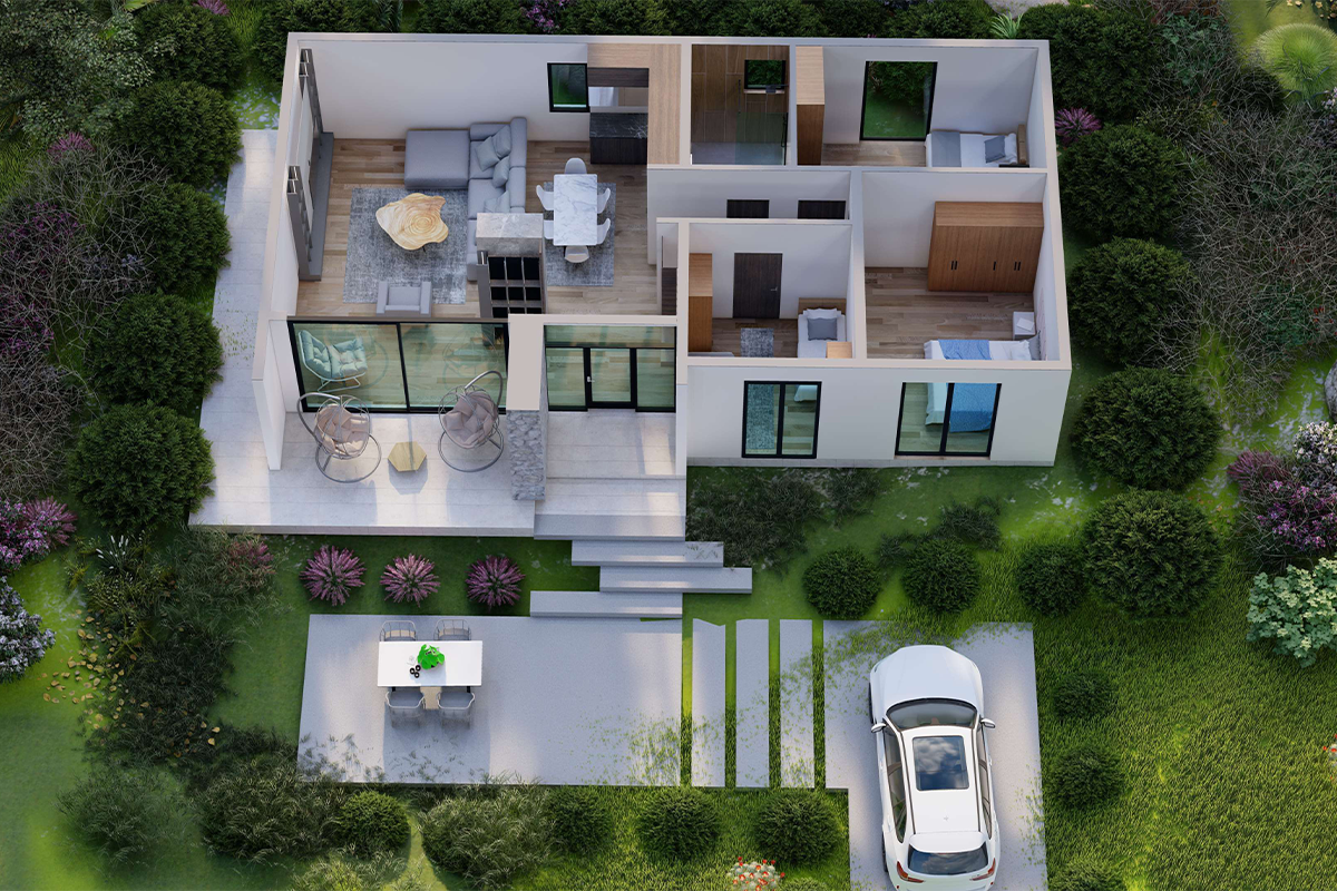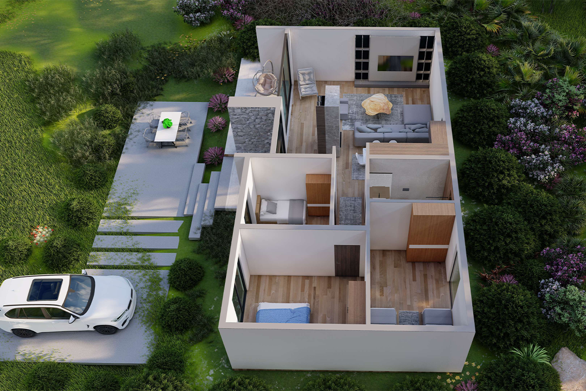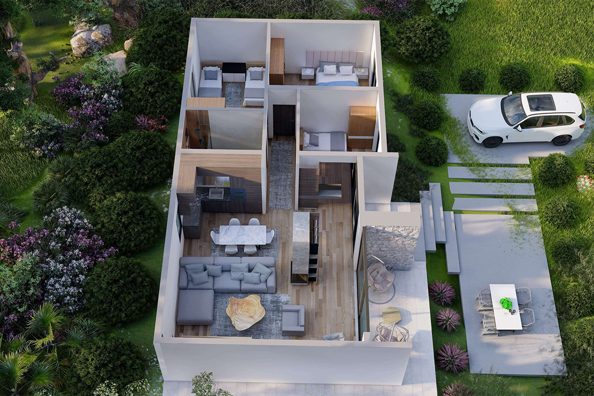 Villa i takon tipit ARRA, ka orientim nga të gjitha anët duke ofruar kështu ndriçim natyral gjatë gjithë ditës dhe në të gjitha hapësirat me këtë renditje të hapësirave të brendshme; qëndrimin ditor, kuzhinë, tri dhoma gjumi, banjo, tualet dhe terasë.