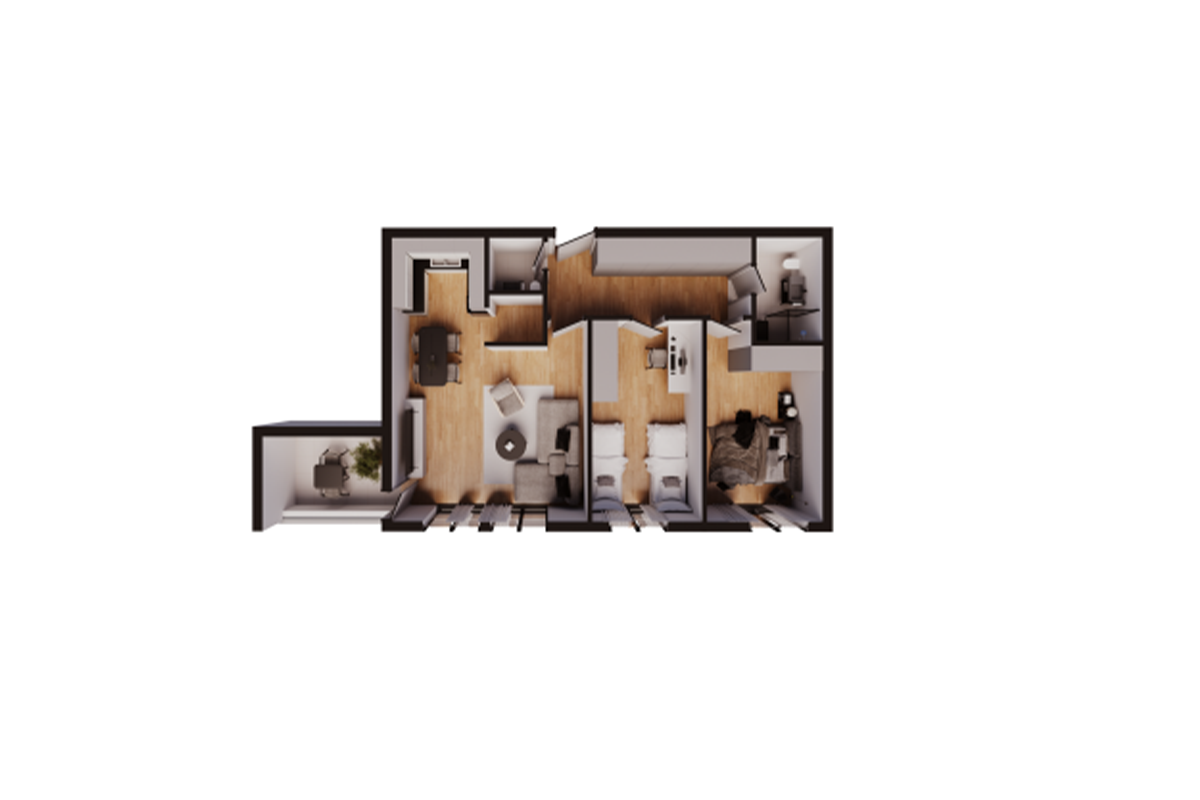 Banesa ka orientim nga perëndimi dhe jugu dhe ka këtë renditje të hapësirave të brendshme: qëndrim ditor, kuzhinë, dy dhoma të gjumit, një banjo, tualet, depo dhe ballkon.