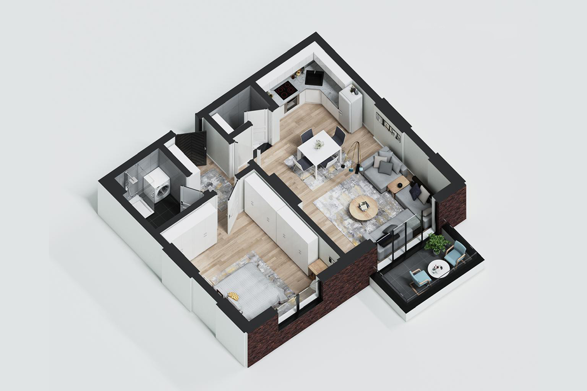 Banesa ka këtë renditje të hapësirave të brendshme: qëndrim ditor, kuzhinë, një dhomë gjumi, një banjo, depo dhe një ballkon.