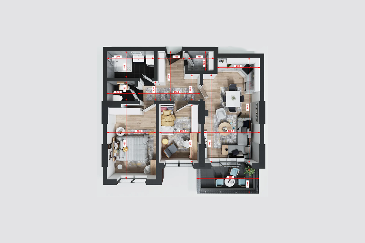 Banesa ka orientim nga perëndimi dhe ka këtë renditje të hapësirave të brendshme: qëndrim ditor, kuzhinë, dy dhoma gjumi, një banjo, tualet, depo dhe një ballkon.