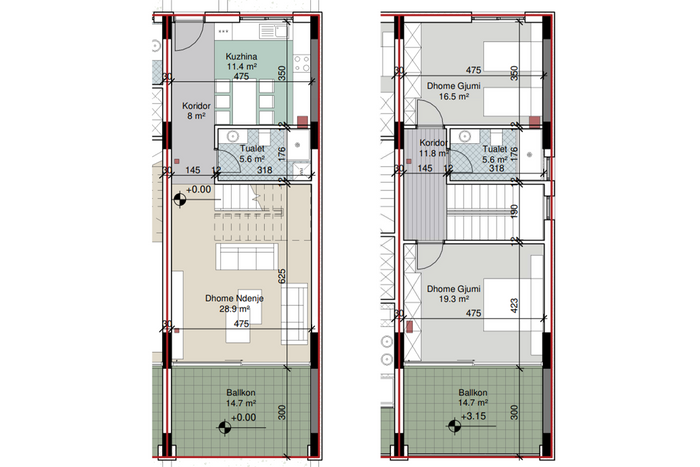 Banesa duplex me sipërfaqe 172m², ka orientim nga perëndimi që i ofron hapësirës ndriçim natyral gjatë gjithë ditës dhe ka këto hapësira të brendshme; qëndrim ditor, kuzhinë, dy dhoma gjumi, dy banjo dhe dy tarraca.