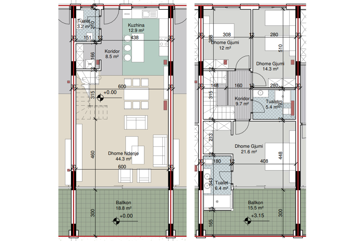 Banesa duplex me sipërfaqe 1210.2m², ka orientim nga perëndimi që i ofron hapësirës ndriçim natyral gjatë gjithë ditës dhe ka këto hapësira të brendshme; qëndrim ditor, kuzhinë, tri dhoma gjumi me njërën prej tyre master, dy banjo, një tualet dhe dy tarraca.