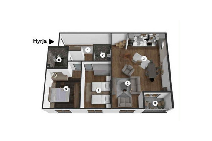 Banesa ka orientim nga lindja dhe jugu dhe ka këtë renditje të hapësirave të brendshme: qëndrimin ditor, kuzhinë, dy dhoma gjumi, banjo, tualet dhe një ballkon.