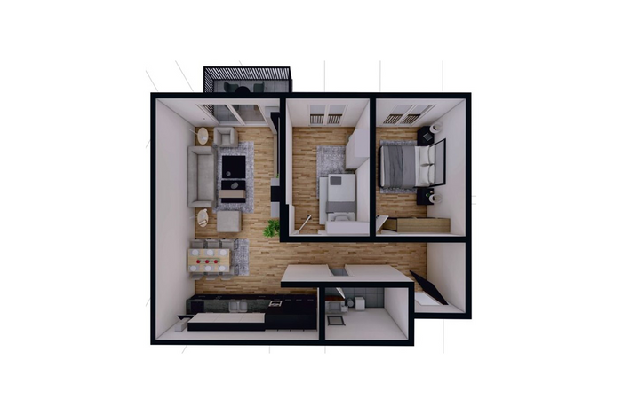 Banesa ka këtë renditje të hapësirave të brendshme: qëndrim ditor, kuzhinë, dy dhoma gjumi, banjo dhe dy ballkone.