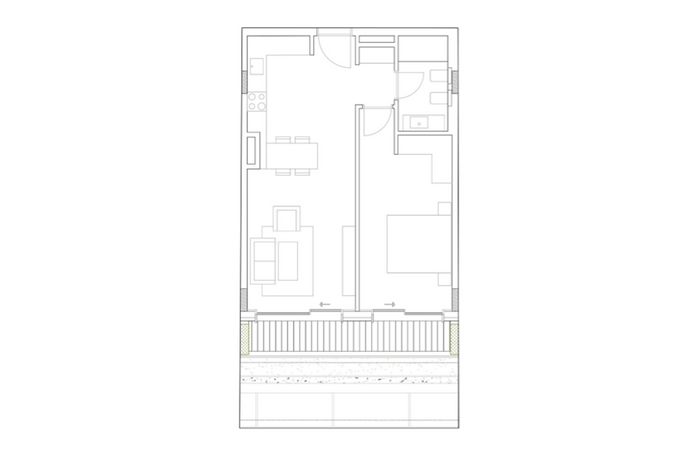 Banesa ka orientim nga jugu dhe perëndimi dhe ka këtë renditje të hapësirave të brendshme; qëndrim ditor, kuzhinë, një dhomë gjumi, banjo dhe tarracë.