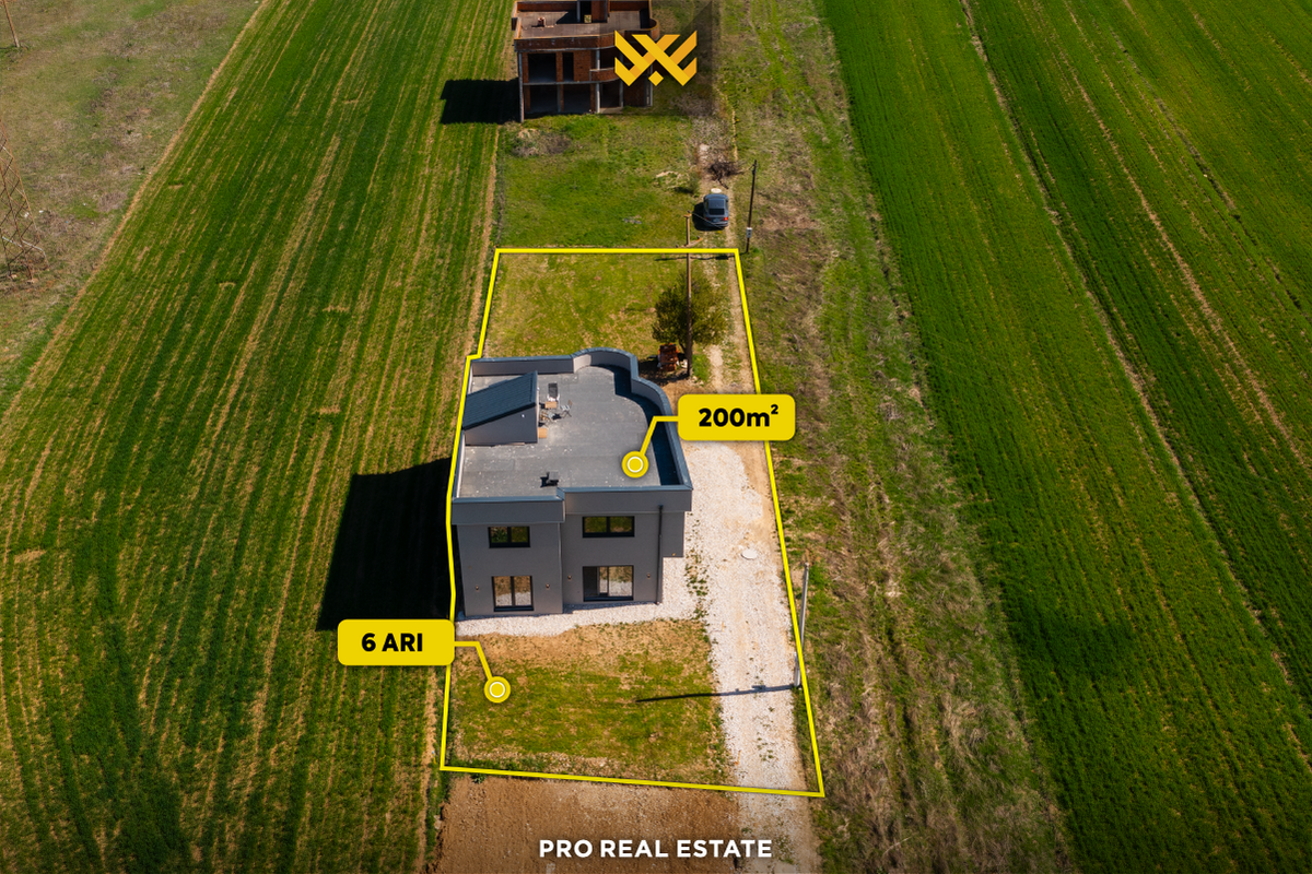 Das Haus hat eine Ausrichtung von allen Seiten, ist in Erdgeschoss und ein Obergeschoss unterteilt, mit folgender Anordnung der Innenräume: Wohnzimmer, Küche, drei Schlafzimmer, Badezimmer, Toilette und Balkon.