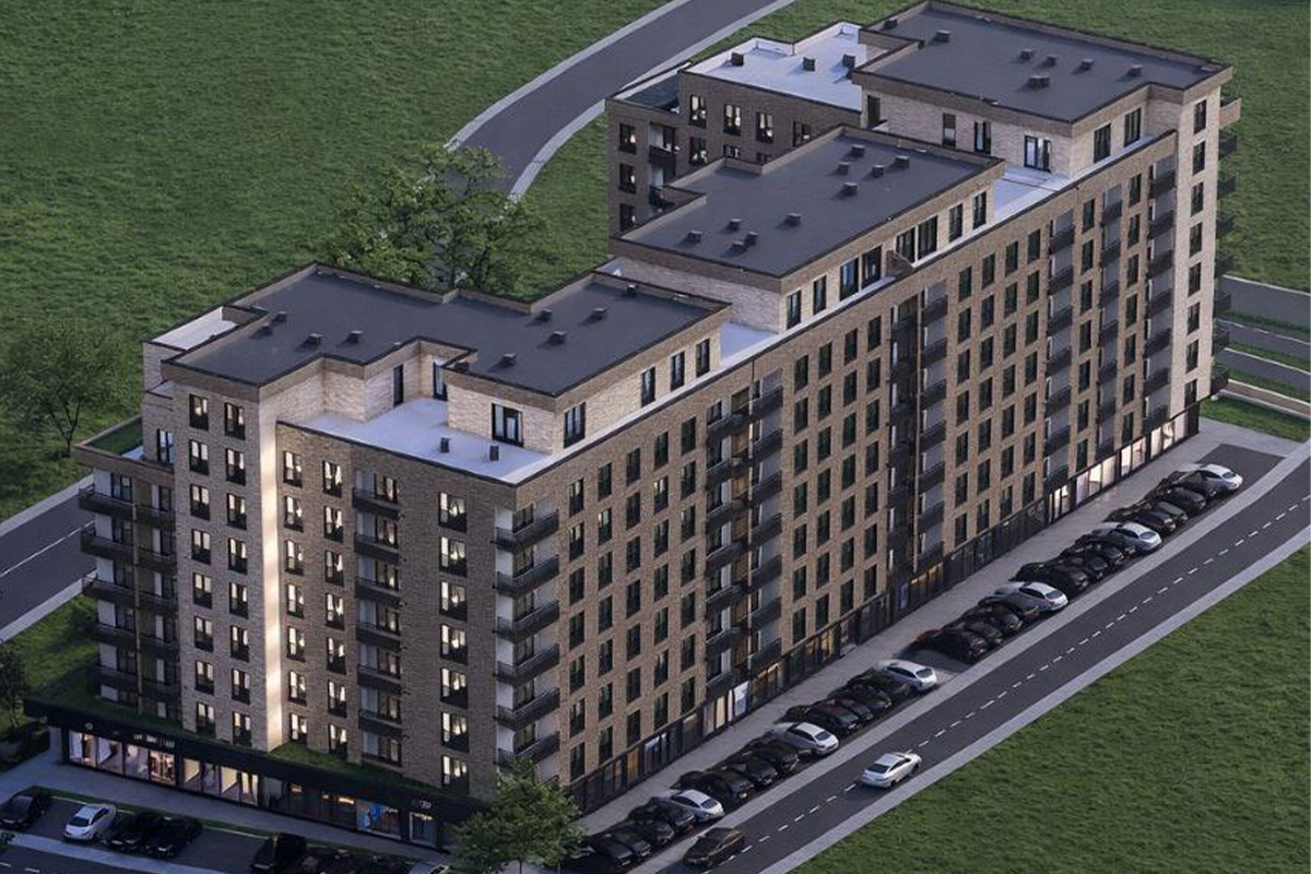 Moderne Wohnanlage in Prizren mit eleganter Ziegelfassade, hellen und funktionalen Wohnungen, großzügigen Balkonen, Innen- und Außenparkplätzen sowie Grünflächen, die Ruhe und Komfort in der Nähe aller notwendigen Dienstleistungen bieten.