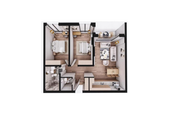 Die Wohnung hat eine Ausrichtung nach Osten und Süden, mit folgender Anordnung der Innenräume: Wohnzimmer, Küche, zwei Schlafzimmer, Badezimmer, Toilette, Abstellraum und Balkon.