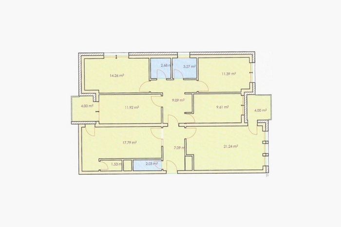 Die Wohnung hat eine gute Ausrichtung nach Westen und Süden mit folgender Anordnung der Innenräume: Wohnzimmer, Küche, drei Schlafzimmer, ein Arbeitszimmer, ein Badezimmer, eine Toilette und zwei Balkone.
