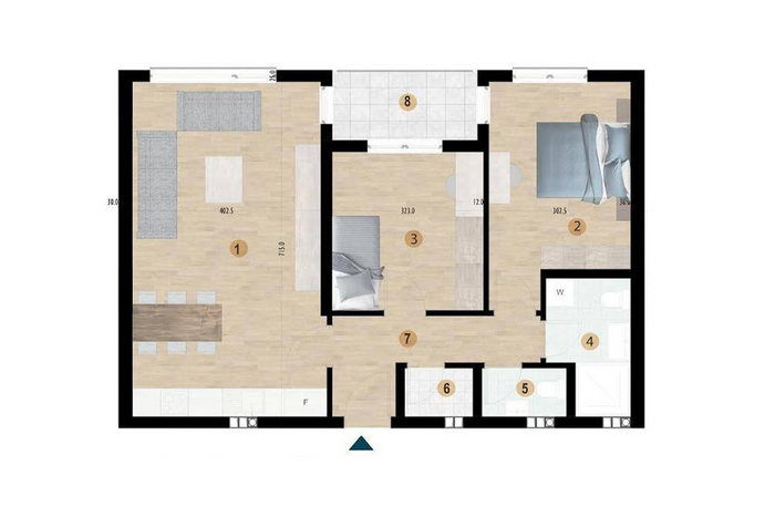 Die Wohnung hat eine Ausrichtung nach Westen und Norden und verfügt über folgende Anordnung der Innenräume: Wohnzimmer, Küche, zwei Schlafzimmer, Badezimmer, Toilette, Abstellraum und Balkon.