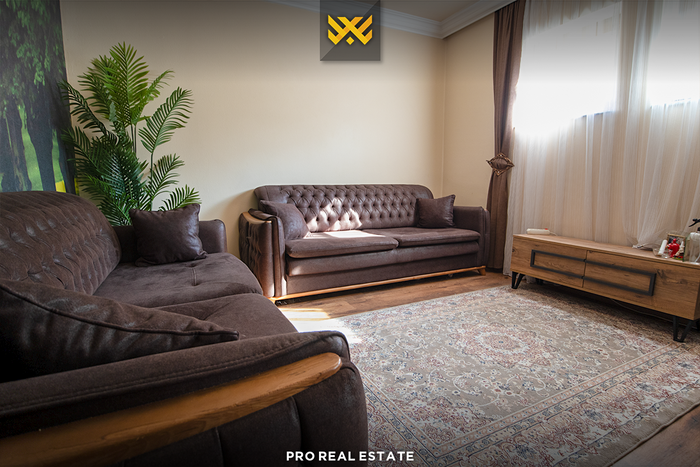 Die Etage hat eine Ausrichtung nach Osten und Süden und verfügt über folgende Anordnung der Innenräume: Wohnzimmer, Küche mit Essbereich, zwei Schlafzimmer, Badezimmer und Toilette.