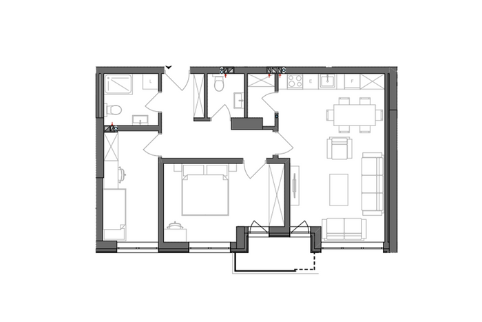 Die Wohnung hat eine westliche Ausrichtung und verfügt über folgende Anordnung der Innenräume: Wohnzimmer, Küche, zwei Schlafzimmer, ein Badezimmer, ein WC, Abstellraum und Terrasse.