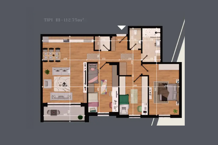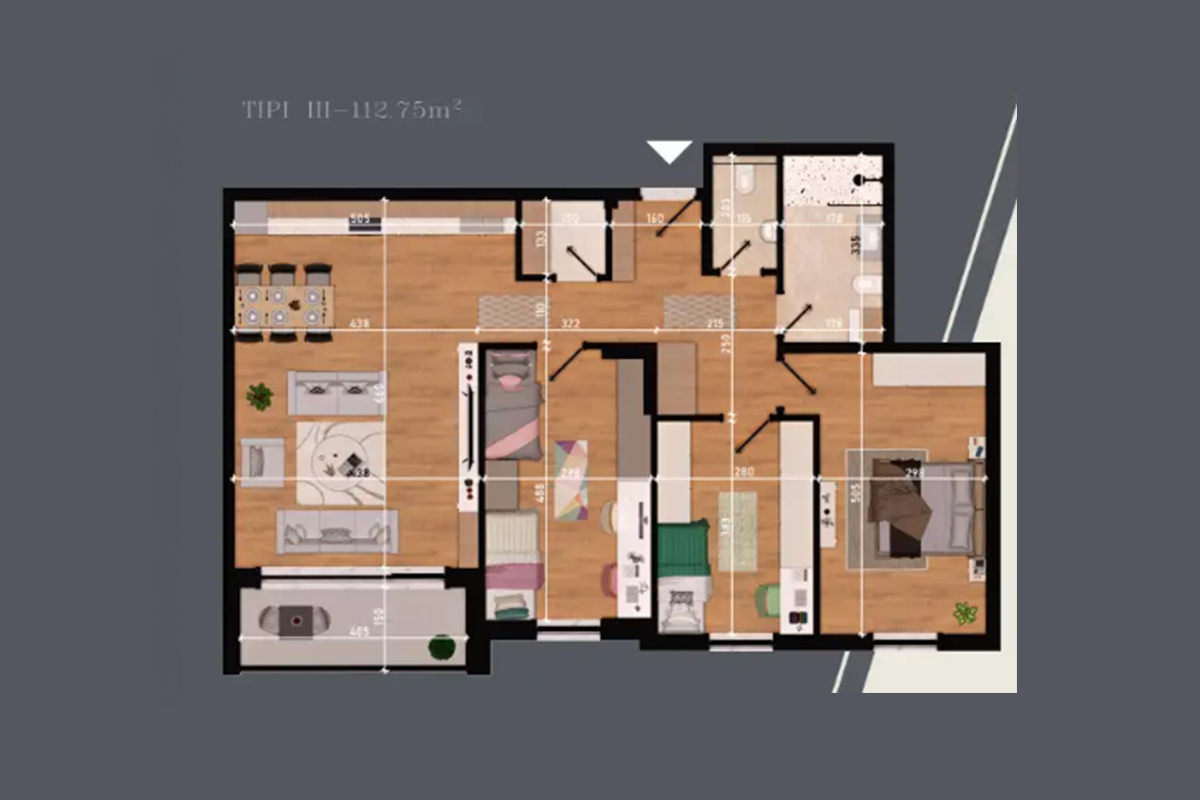 Die Wohnung hat folgende Anordnung der Innenräume: Wohnzimmer, Küche, drei Schlafzimmer, ein Badezimmer, eine Toilette und einen Balkon.