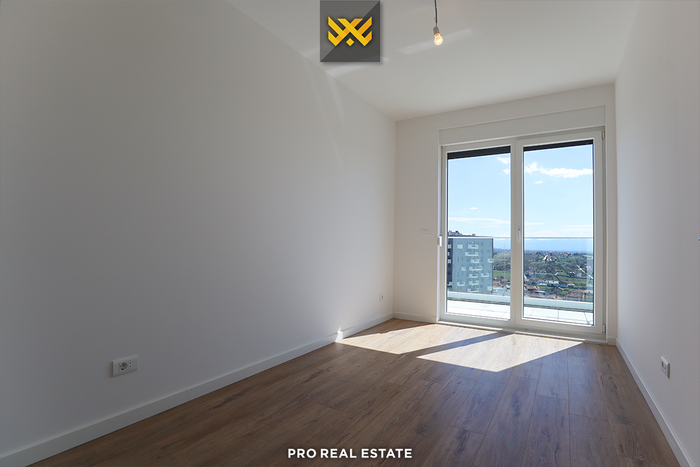 Die Wohnung hat eine Südausrichtung und folgende Anordnung der Innenräume: Wohnzimmer, Küche, zwei Schlafzimmer, von denen eines ein eigenes Bad hat, ein Badezimmer und einen Balkon mit Blick auf den Park des Komplexes.