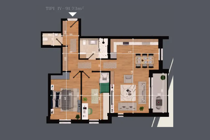 Die Wohnung hat folgende Anordnung der Innenräume: Wohnzimmer, Küche, zwei Schlafzimmer, ein Badezimmer, Toilette, Abstellraum und Balkon.