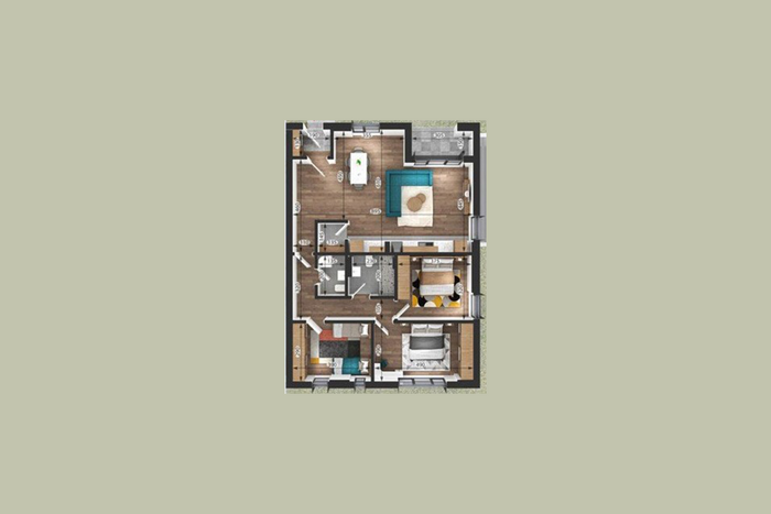 Die Wohnung hat eine Ausrichtung nach Osten und Süden und verfügt über folgende Raumaufteilung: Wohnzimmer, Küche, drei Schlafzimmer, ein Badezimmer und einen Balkon.
