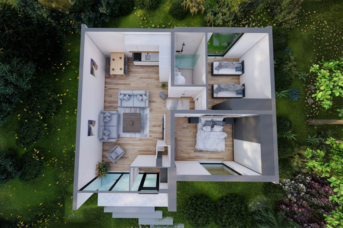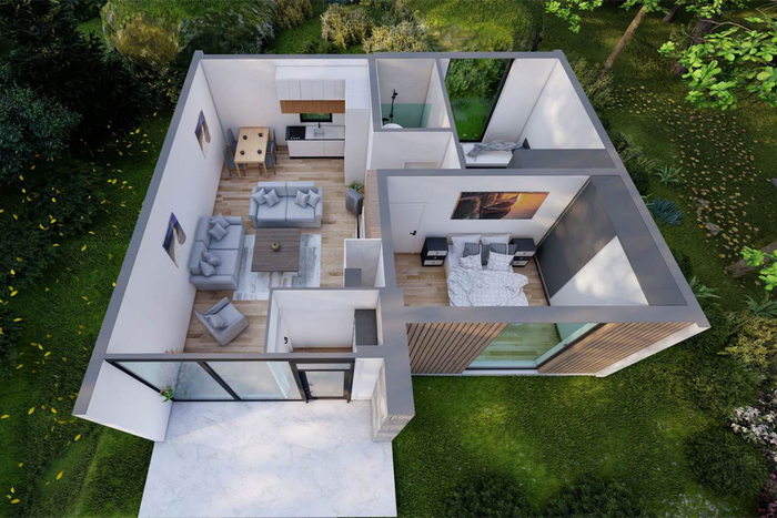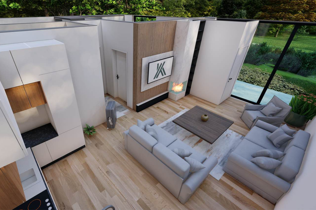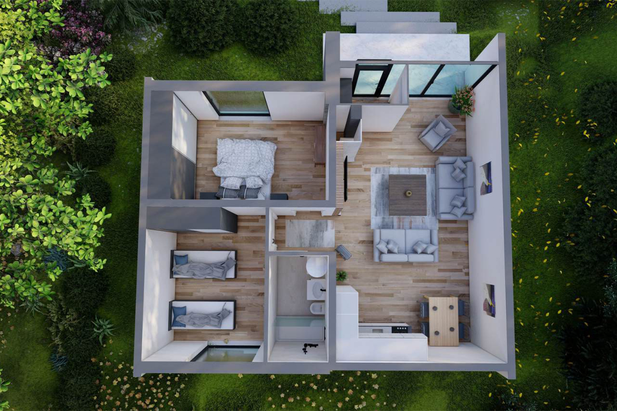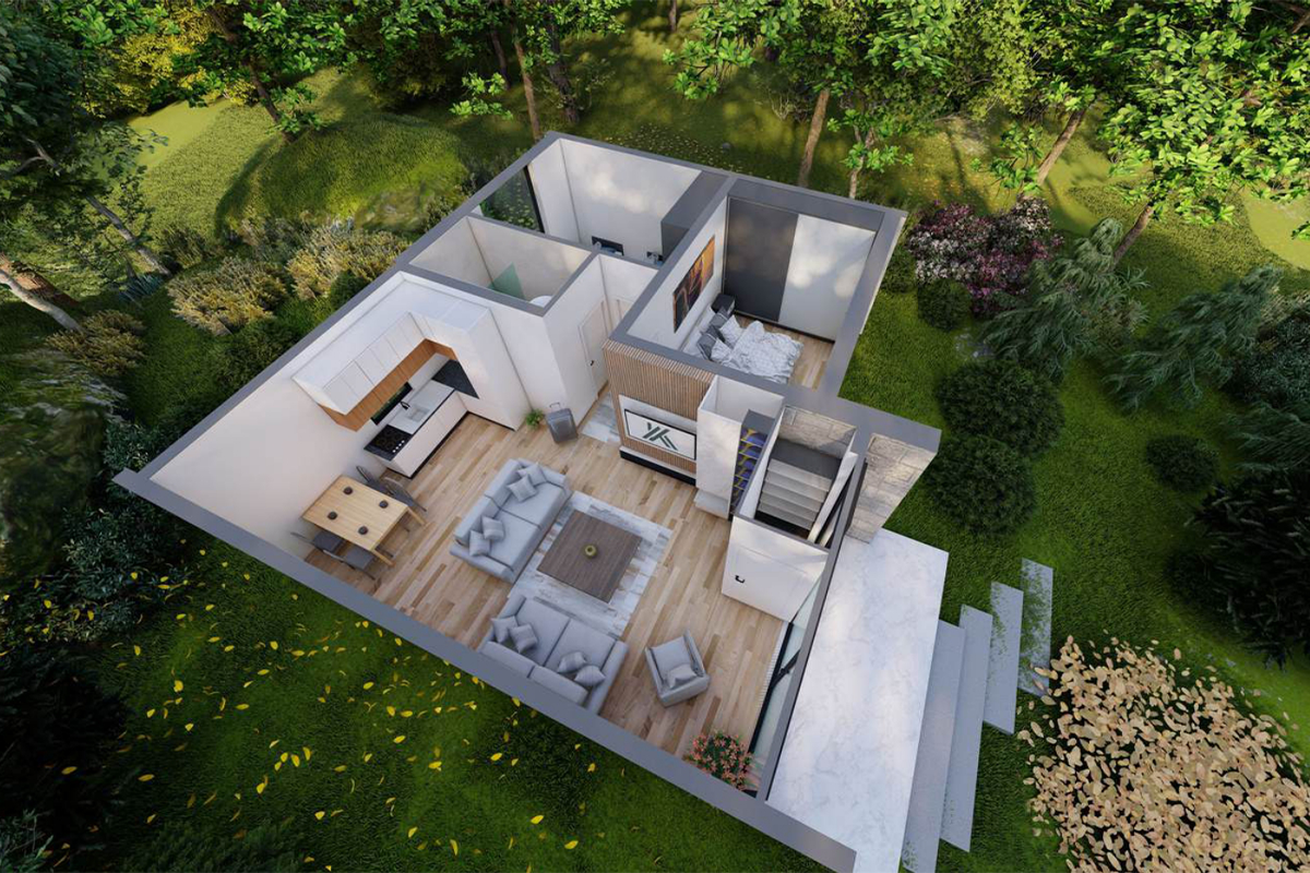 Die Villa gehört zum Typ LAJTHIA, hat eine Ausrichtung von allen Seiten und bietet so den ganzen Tag über natürliches Licht in allen Räumen mit dieser Anordnung der Innenräume: Wohnzimmer, Küche, zwei Schlafzimmer, Badezimmer, Toilette und Terrasse.
