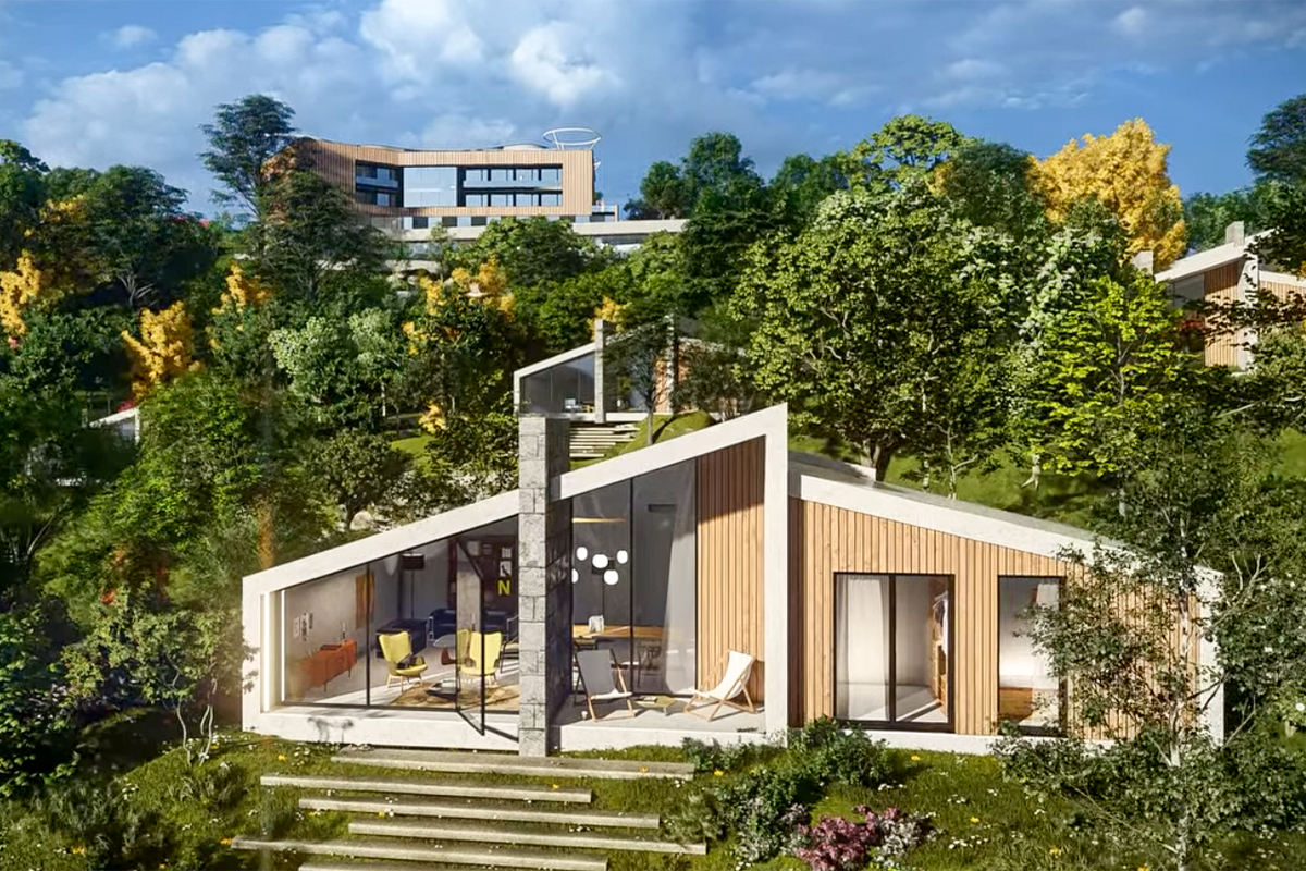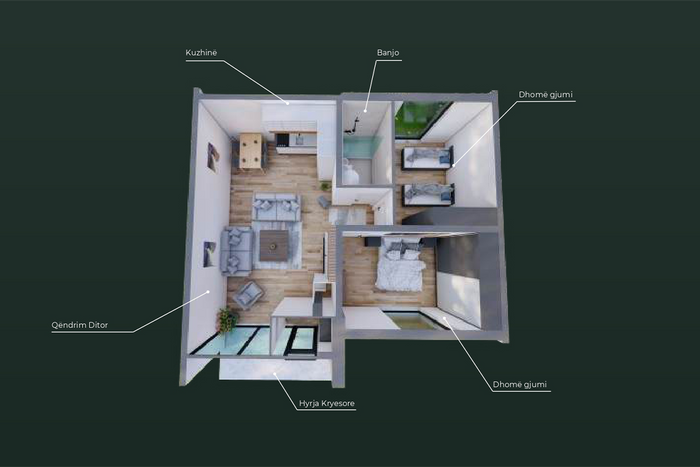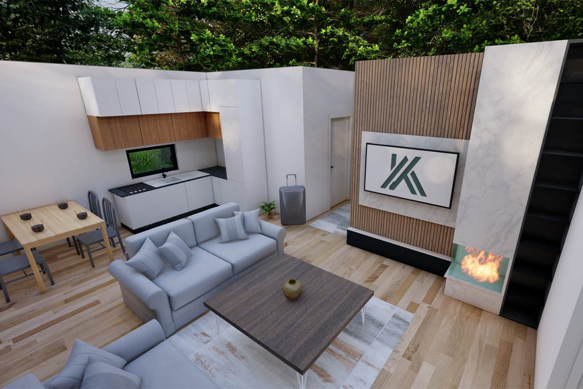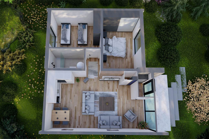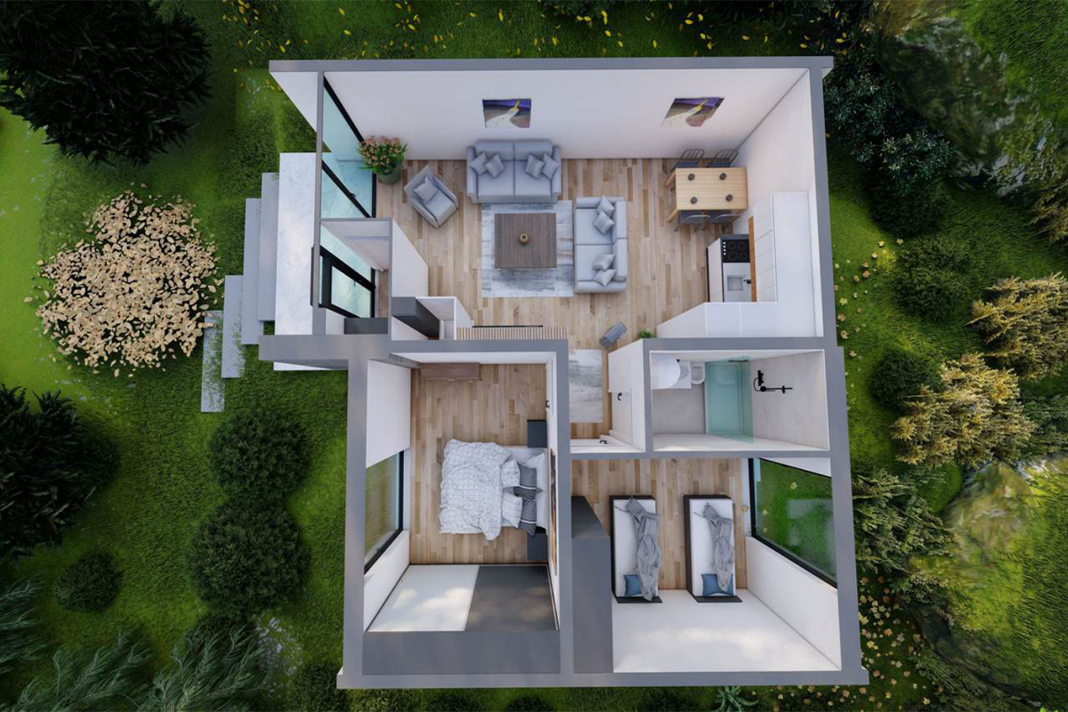 Die Villa gehört zum Typ LAJTHIA, hat eine Ausrichtung von allen Seiten und bietet so den ganzen Tag über natürliches Licht in allen Räumen mit dieser Anordnung der Innenräume: Wohnzimmer, Küche, zwei Schlafzimmer, Badezimmer, Toilette und Terrasse.