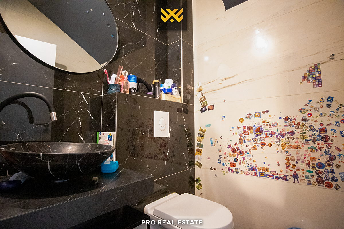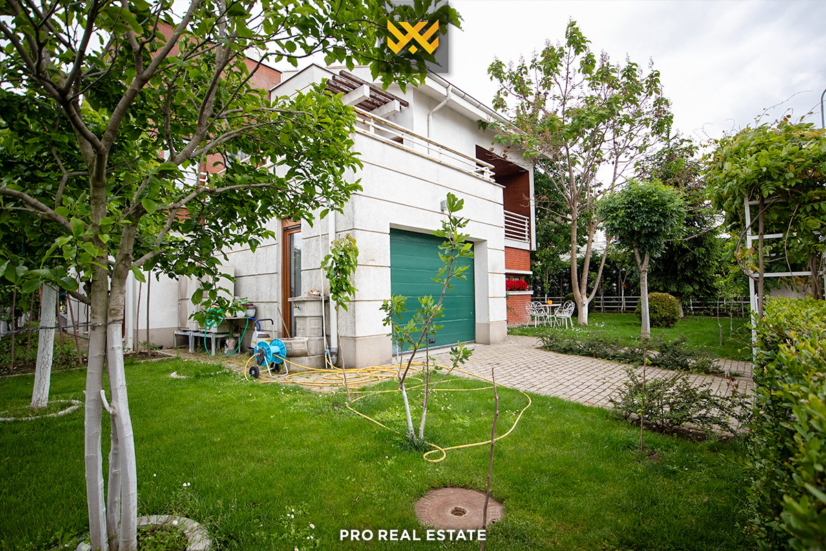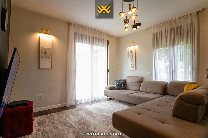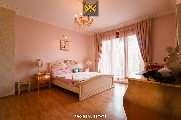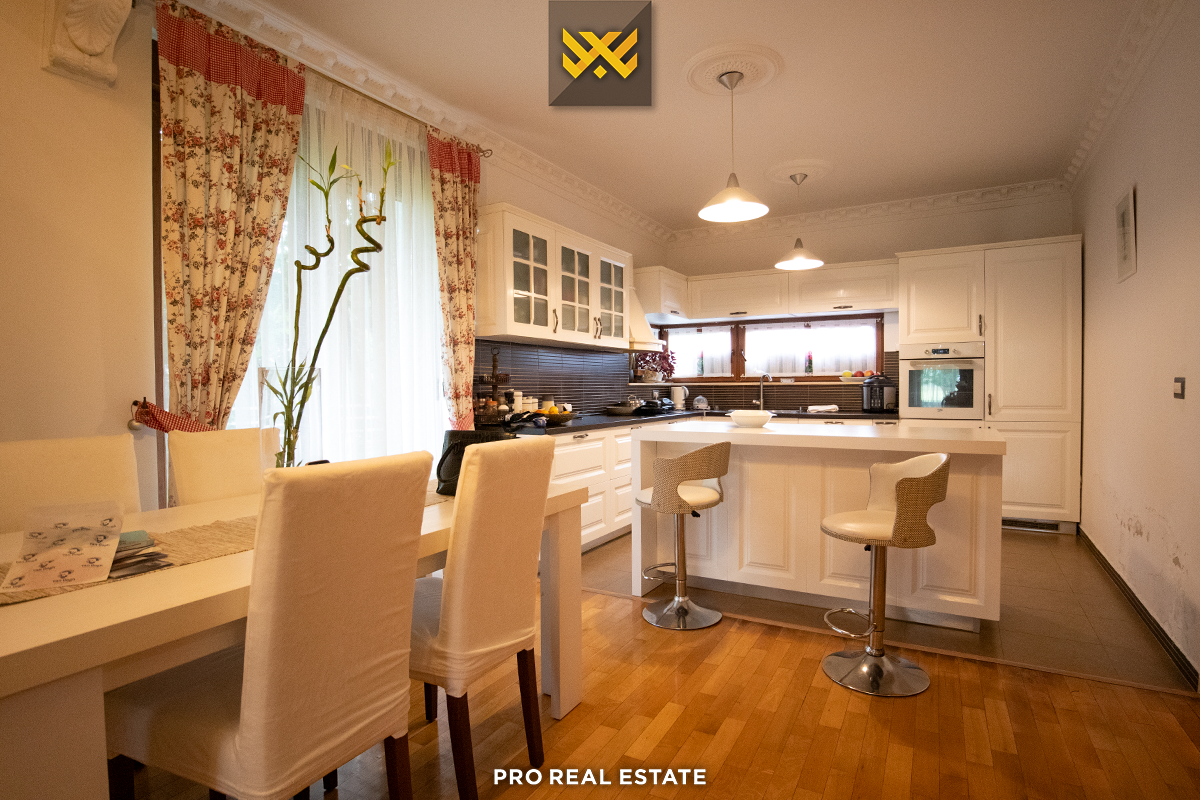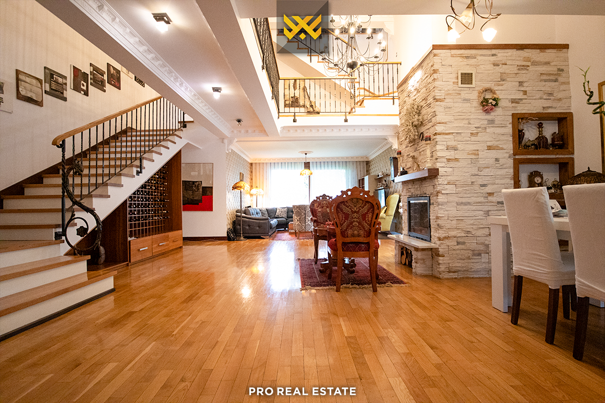 Das Haus mit einer Fläche von 500m² hat eine Ausrichtung von allen Seiten und bietet den ganzen Tag über natürliches Licht. Es ist in ein Untergeschoss, ein Erdgeschoss und ein Obergeschoss unterteilt mit folgender Raumaufteilung: Wohnzimmer, Küche, drei Schlafzimmer, eines davon mit Ankleidezimmer und eigenem Bad, zwei Bäder, WC, Abstellraum und drei Balkone.