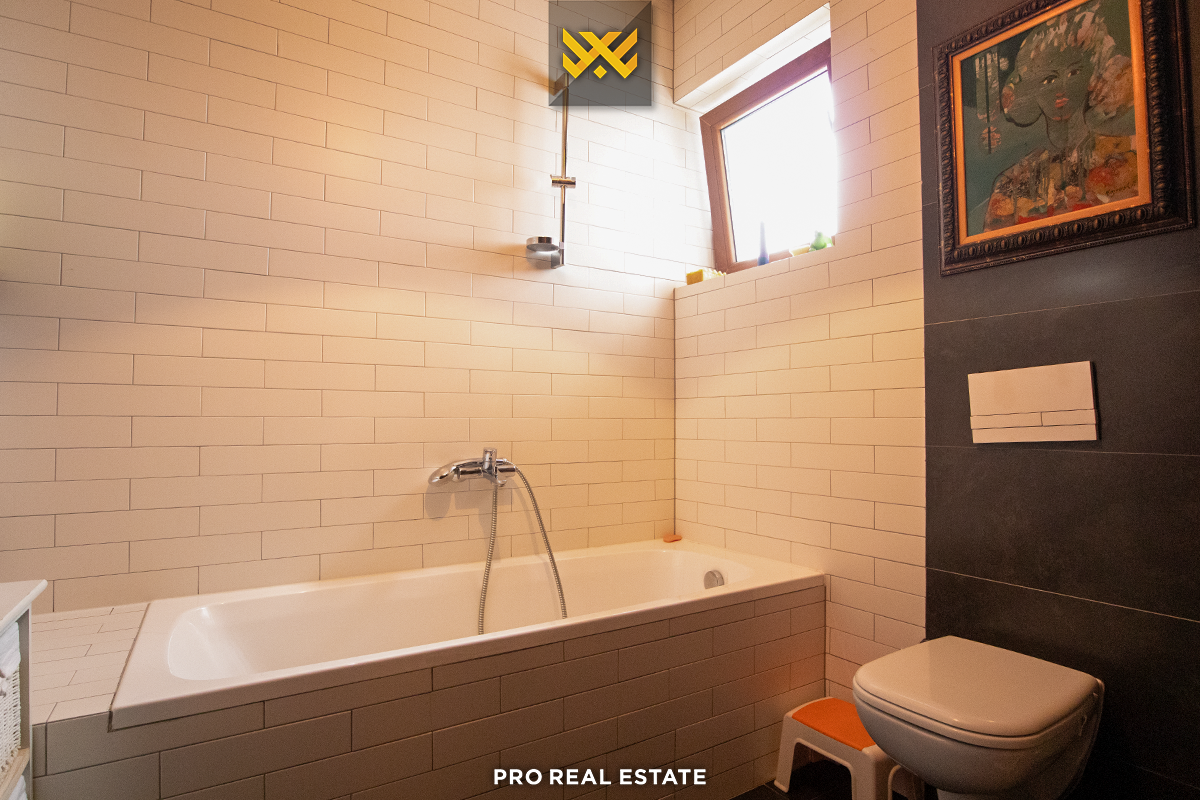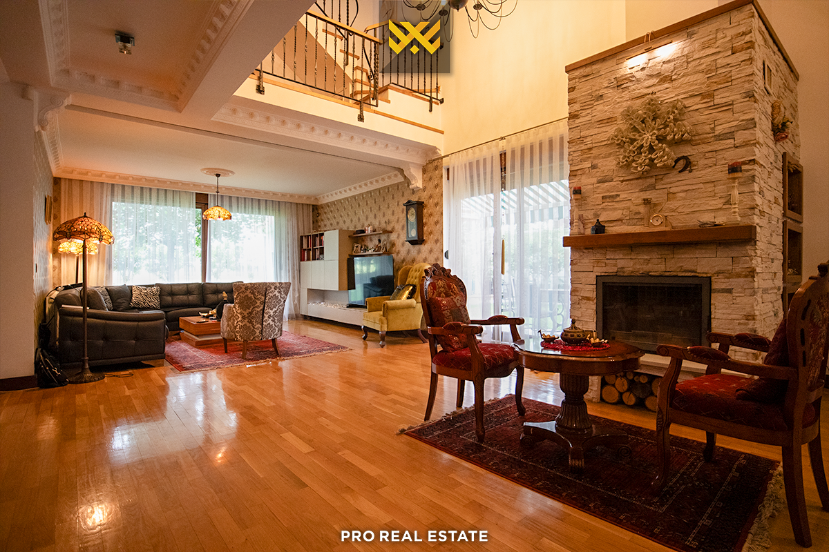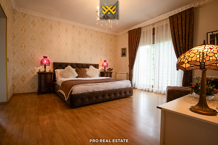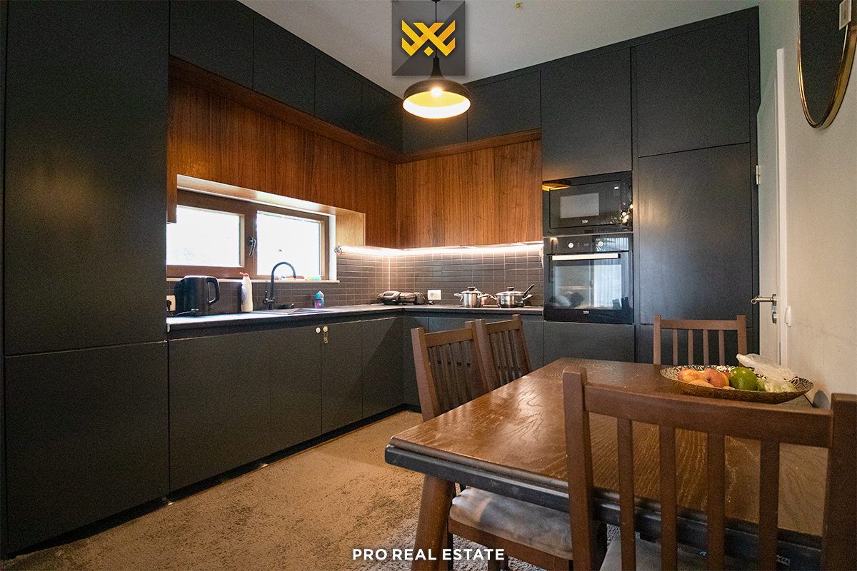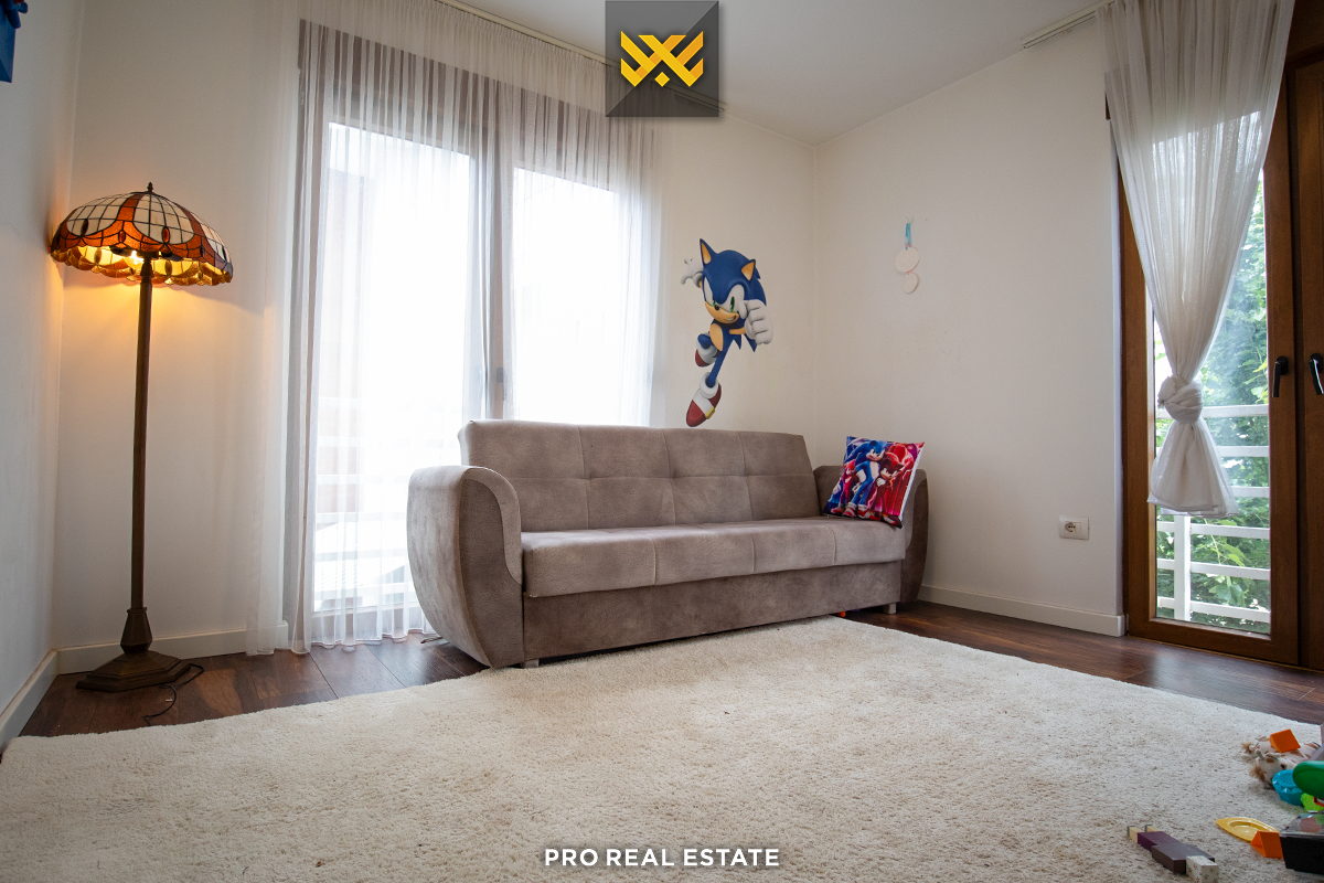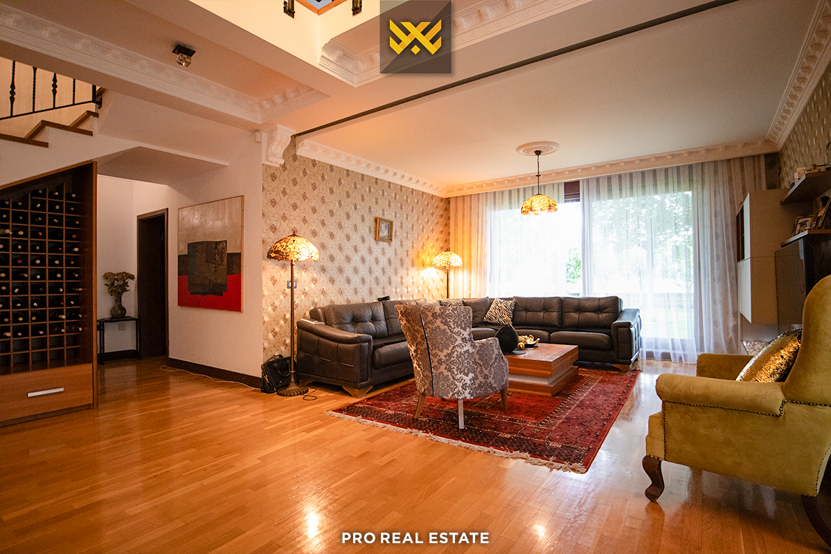 Das Haus mit einer Fläche von 500m² hat eine Ausrichtung von allen Seiten und bietet den ganzen Tag über natürliches Licht. Es ist in ein Untergeschoss, ein Erdgeschoss und ein Obergeschoss unterteilt mit folgender Raumaufteilung: Wohnzimmer, Küche, drei Schlafzimmer, eines davon mit Ankleidezimmer und eigenem Bad, zwei Bäder, WC, Abstellraum und drei Balkone.