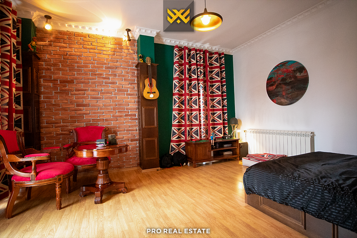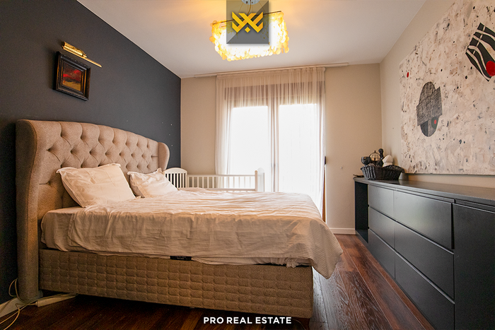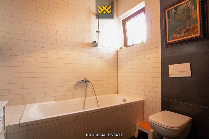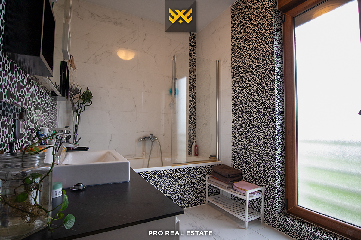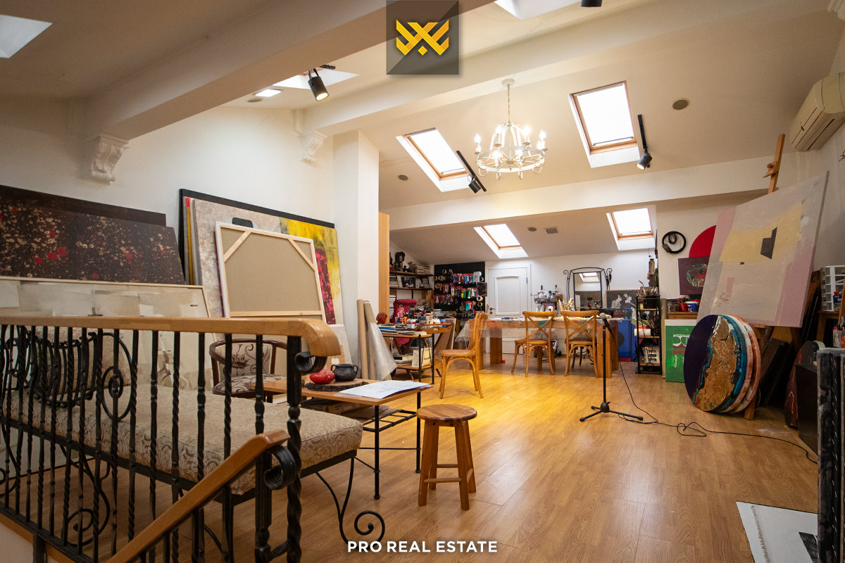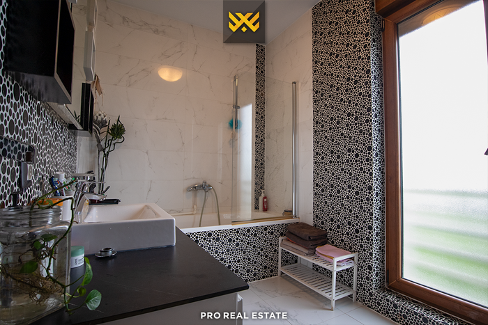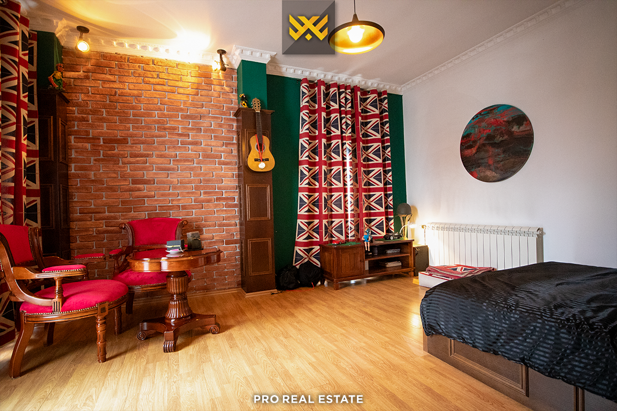 Das Haus mit einer Fläche von 500m² hat eine Ausrichtung von allen Seiten und bietet den ganzen Tag über natürliches Licht. Es ist in ein Untergeschoss, ein Erdgeschoss und ein Obergeschoss unterteilt mit folgender Raumaufteilung: Wohnzimmer, Küche, drei Schlafzimmer, eines davon mit Ankleidezimmer und eigenem Bad, zwei Bäder, WC, Abstellraum und drei Balkone.