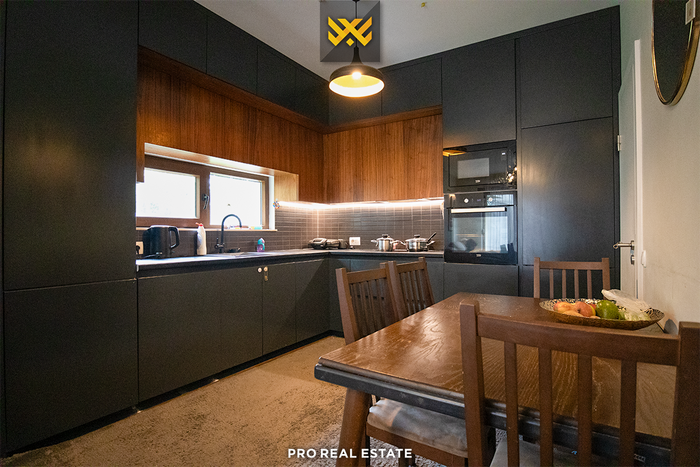 Das Haus mit einer Fläche von 120m² hat ebenfalls eine Ausrichtung von allen Seiten und bietet den ganzen Tag über natürliches Licht. Es ist in Erdgeschoss und Obergeschoss unterteilt mit folgender Raumaufteilung: Wohnzimmer, Küche, zwei Schlafzimmer, Ankleidezimmer, Bad, WC und Abstellraum.
