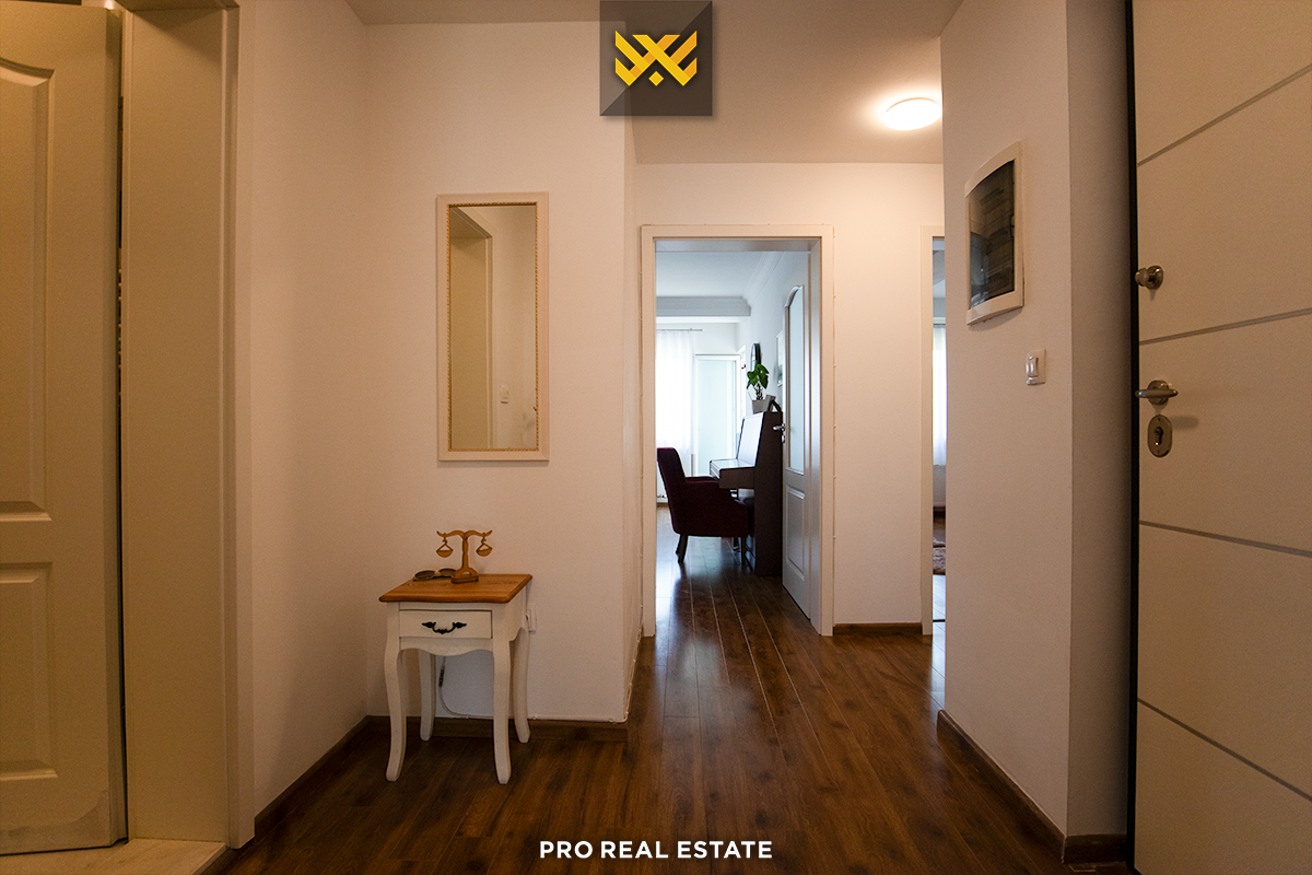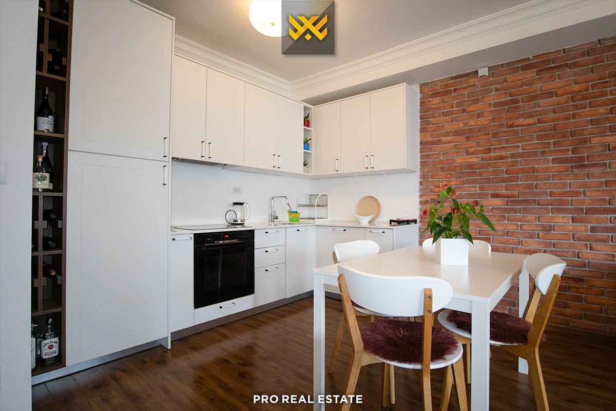 Die Wohnung hat eine Ausrichtung von allen Seiten und verfügt über folgende Anordnung der Innenräume: Wohnzimmer, Küche, zwei Schlafzimmer, Badezimmer, Abstellraum und Balkon.