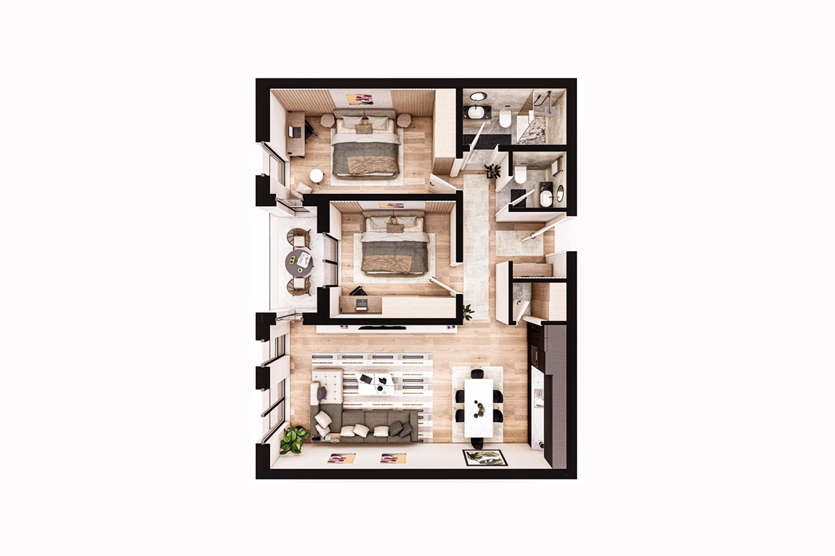 Die Wohnung hat eine Ausrichtung nach Osten mit folgender Anordnung der Innenräume: Wohnzimmer, Küche, zwei Schlafzimmer, Badezimmer, Toilette, Abstellraum und Balkon.