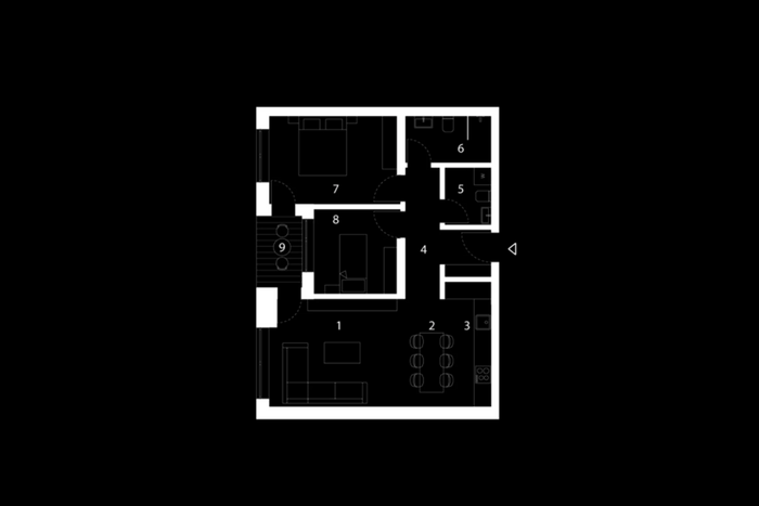 Die Wohnung hat folgende Raumaufteilung: Wohnzimmer, Küche mit Essbereich, zwei Schlafzimmer, zwei Badezimmer und einen Balkon.