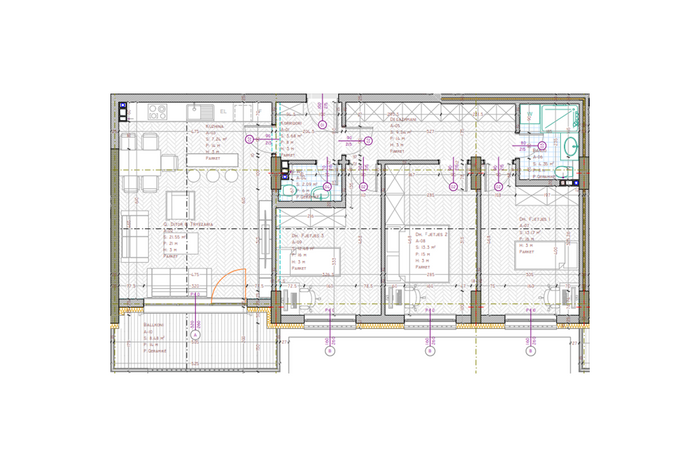 Die Wohnung hat eine Südausrichtung und folgende Aufteilung der Innenräume: Wohnzimmer, Küche, drei Schlafzimmer, ein Badezimmer, ein WC und einen Balkon.