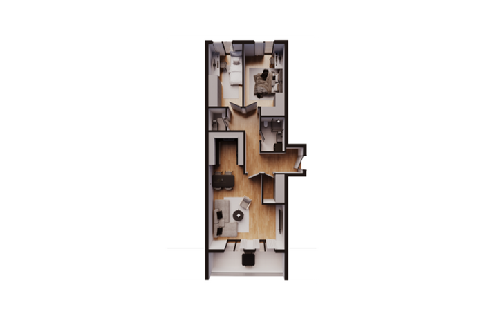 Die Wohnung hat eine Ausrichtung nach Osten und folgende Anordnung der Innenräume: Wohnzimmer, Küche, zwei Schlafzimmer, ein Badezimmer, Toilette, Abstellraum und Balkon.