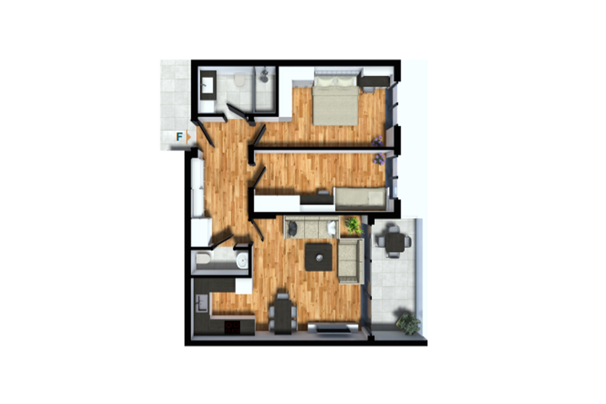 Die Wohnung hat eine Ausrichtung nach Osten und Norden und verfügt über folgende Raumaufteilung: Wohnzimmer, Küche, zwei Schlafzimmer, ein Badezimmer, eine Toilette und einen Balkon.