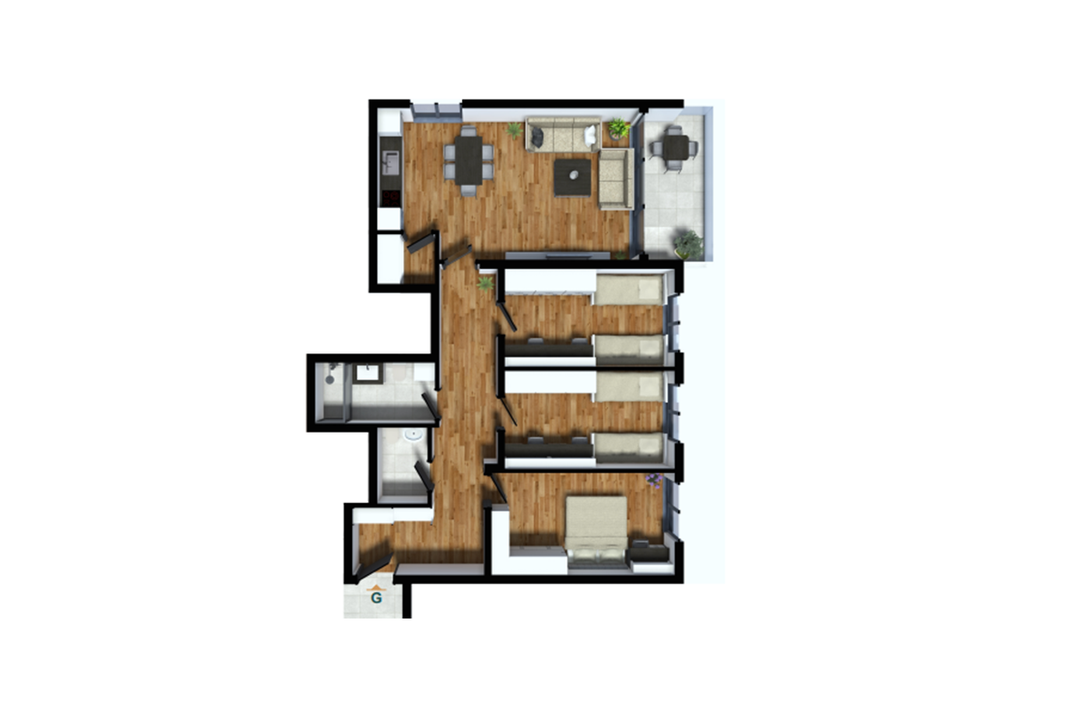 Die Wohnung hat eine Ausrichtung nach Osten und Norden und verfügt über folgende Anordnung der Innenräume: Wohnzimmer, Küche, drei Schlafzimmer, ein Badezimmer, Toilette, Abstellraum und Balkon.