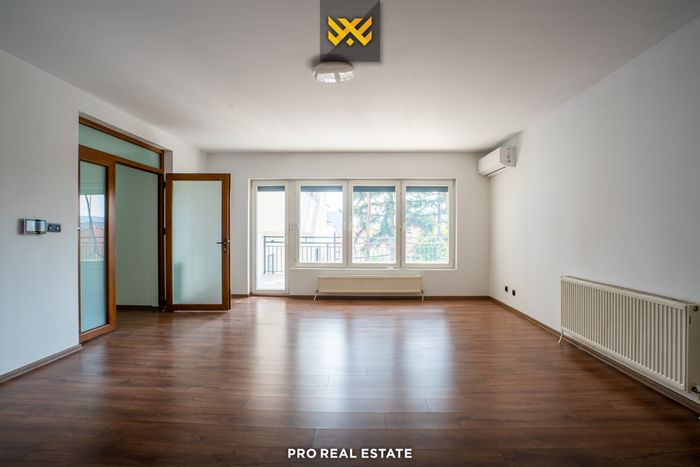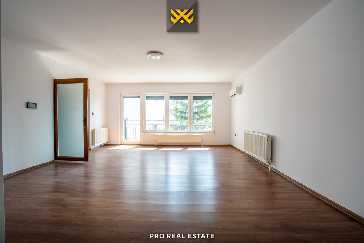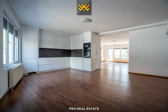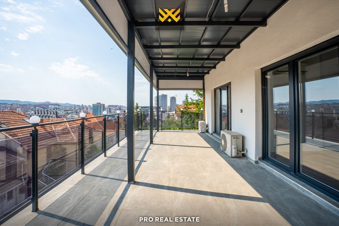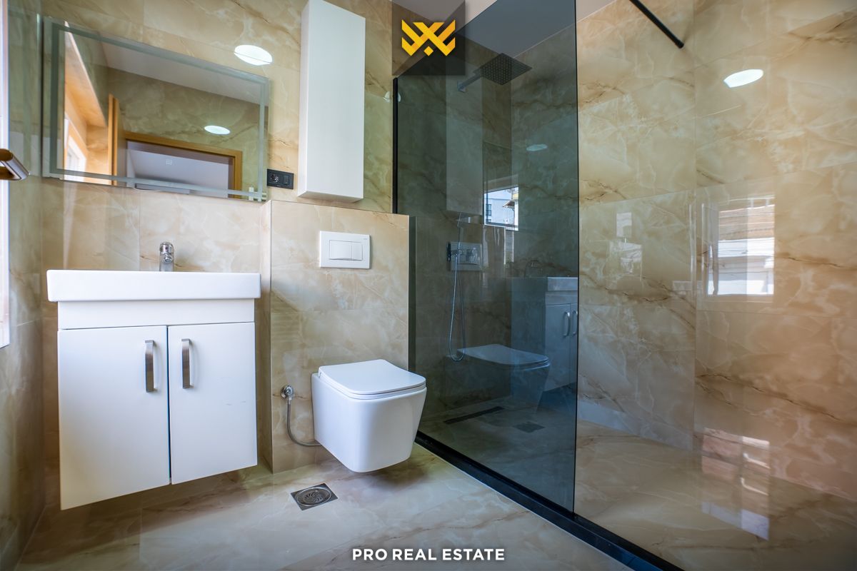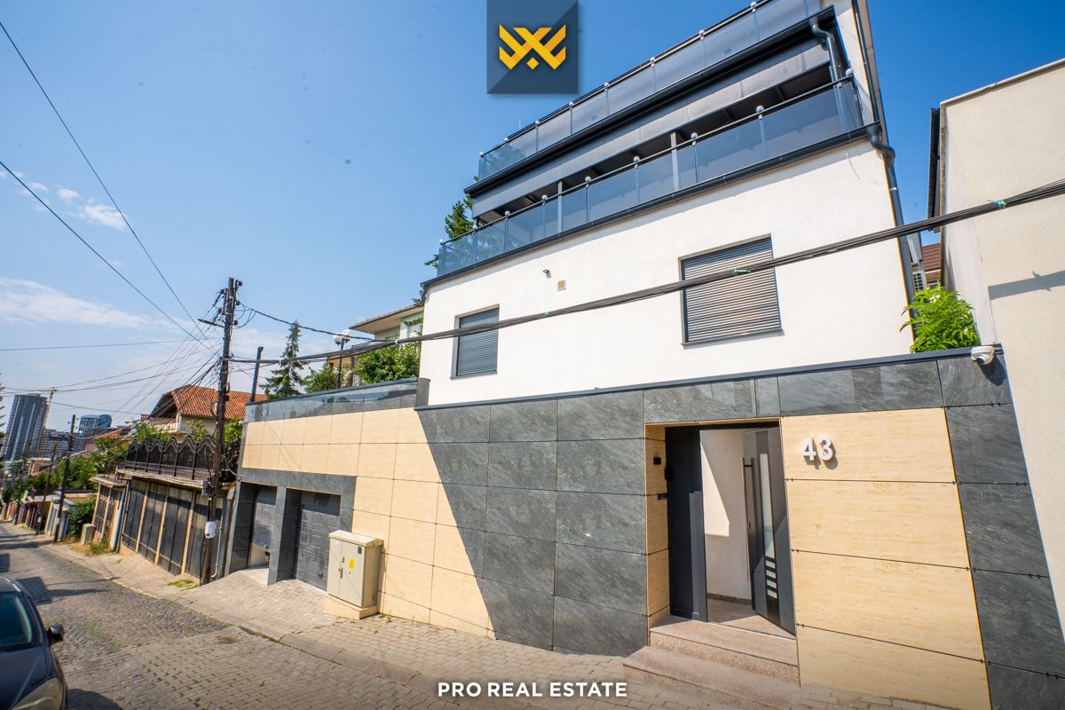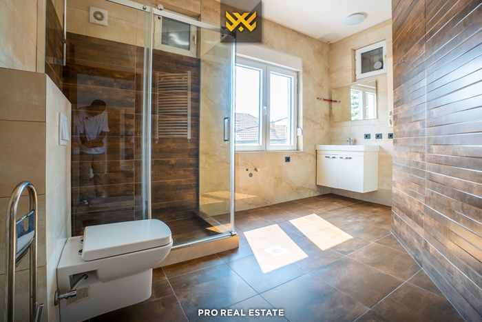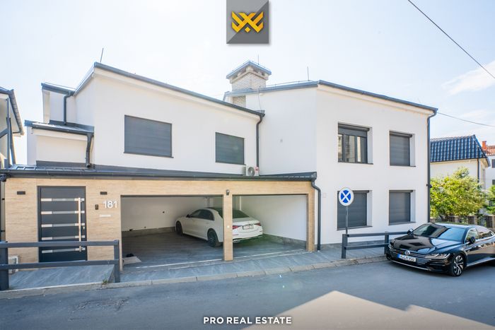 Das Haus hat zwei Eingänge und ist auf drei Etagen gebaut, mit offener Ausrichtung von allen Seiten, die natürliches Licht in jeden Innenraum ermöglicht. Es ist mit einem Smart Home-System ausgestattet, das unter anderem elektrische Rollläden und ein Türsprechanlage umfasst, die über das Telefon gesteuert wird.