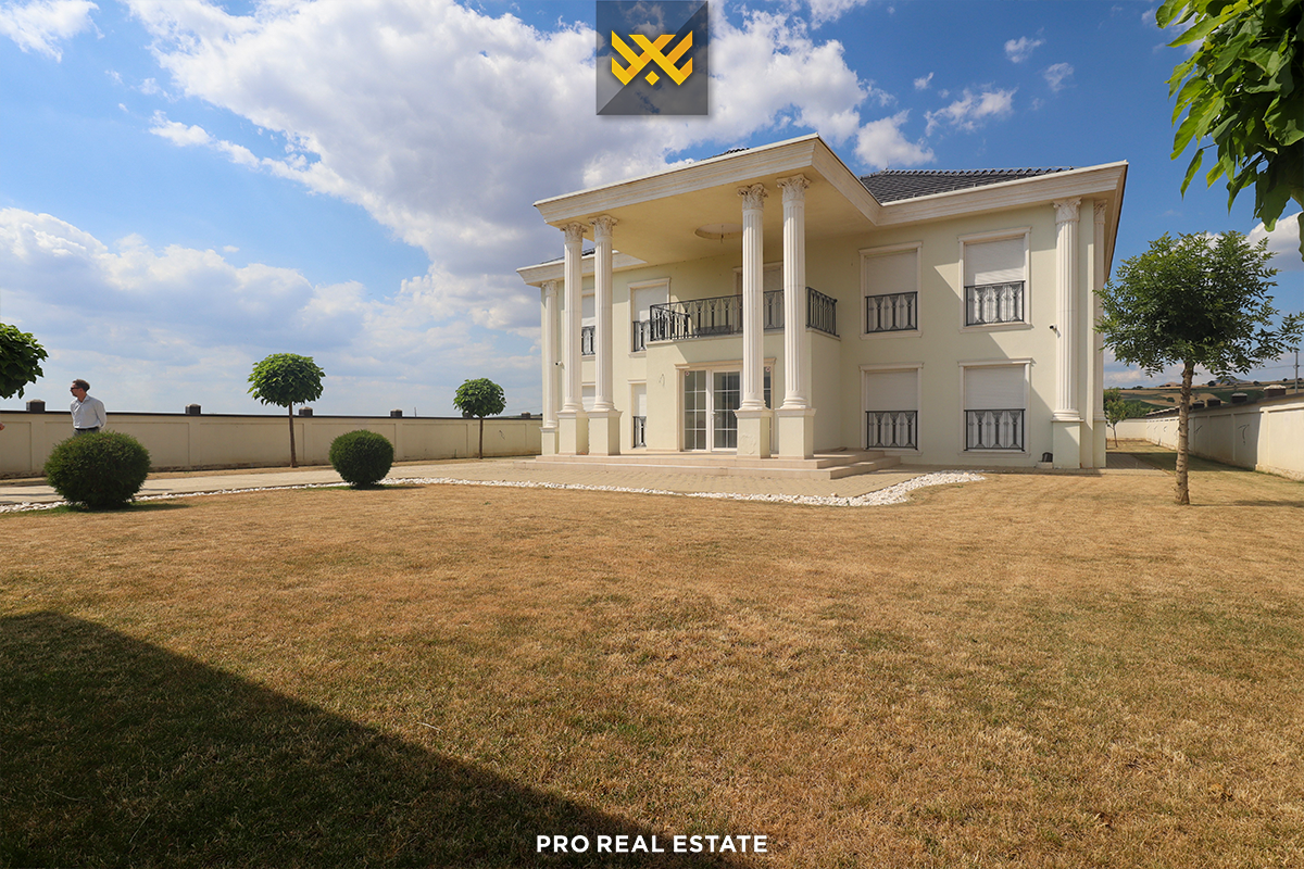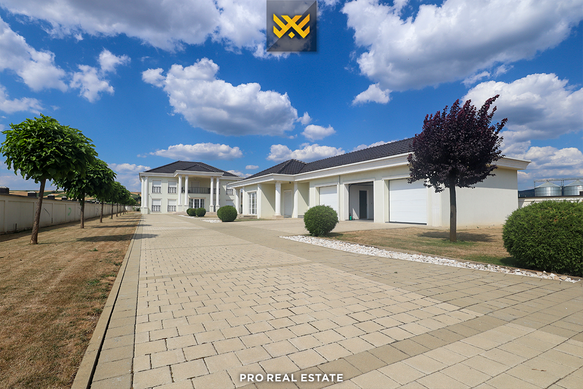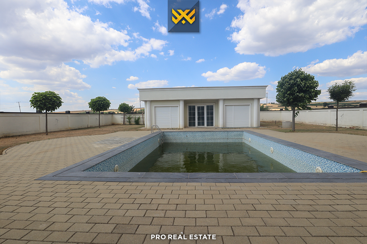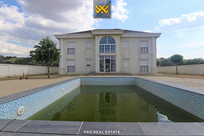 Das Haus hat ein Grundstück mit einer Fläche von 1,28 Ha, einen ausreichend großen und gepflegten Hof, Grünflächen sowie einen Pool und bietet auch ausreichend Platz für Parkmöglichkeiten sowie zwei Garagen.