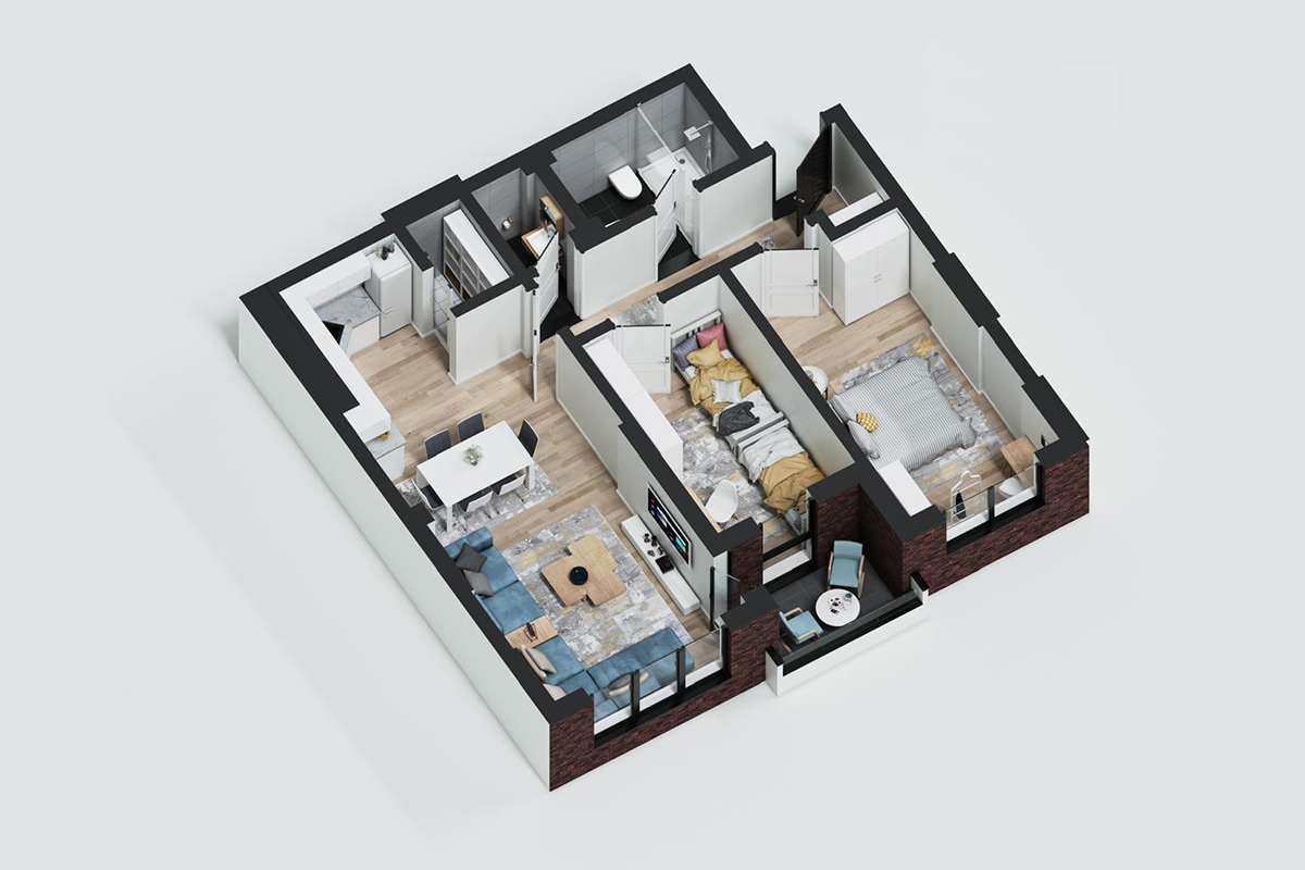 Die Wohnung hat folgende Anordnung der Innenräume: Wohnzimmer, Küche, zwei Schlafzimmer, ein Badezimmer, WC, Abstellraum und einen Balkon.