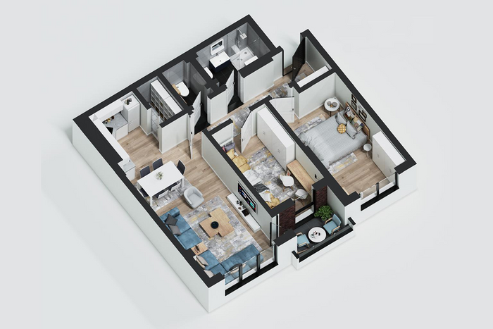 Die Wohnung hat folgende Anordnung der Innenräume: Wohnzimmer, Küche, zwei Schlafzimmer, ein Badezimmer, WC, Abstellraum und einen Balkon.