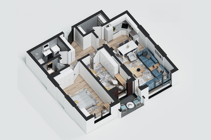 Die Wohnung hat folgende Anordnung der Innenräume: Wohnzimmer, Küche, zwei Schlafzimmer, ein Badezimmer, Toilette, Abstellraum und einen Balkon.