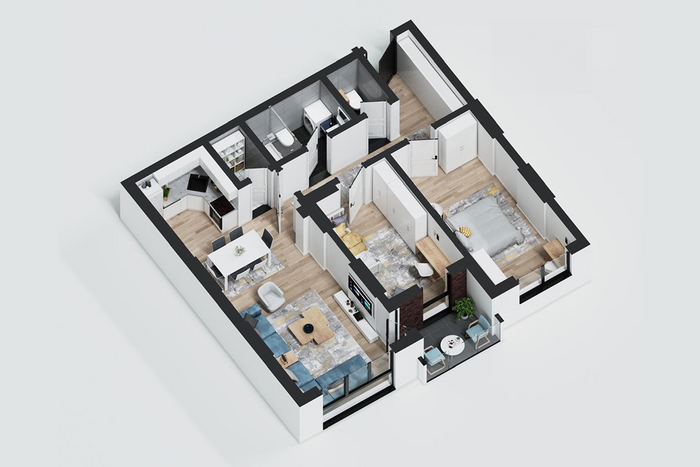 Die Wohnung hat folgende Anordnung der Innenräume: Wohnzimmer, Küche, zwei Schlafzimmer, ein Badezimmer, WC, Abstellraum und einen Balkon.