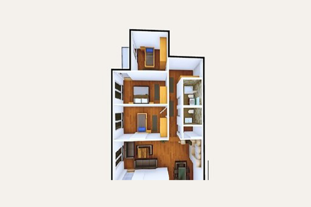 Die Wohnung hat eine Westausrichtung und folgende Anordnung der Innenräume: Wohnzimmer, Küche mit Essbereich, drei Schlafzimmer, zwei Badezimmer, Abstellraum und eine Terrasse.