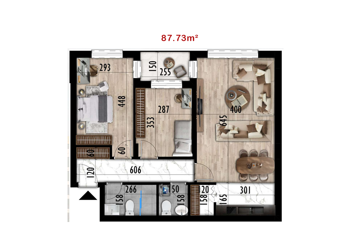 *Die Wohnung mit einer Wohnfläche von 87,73 m² hat eine Ausrichtung nach Westen und Süden und hat folgende Anordnung der Innenräume; Wohnzimmer, Küche mit Essbereich, zwei Schlafzimmer, Badezimmer, Toilette, Abstellraum und Balkon.