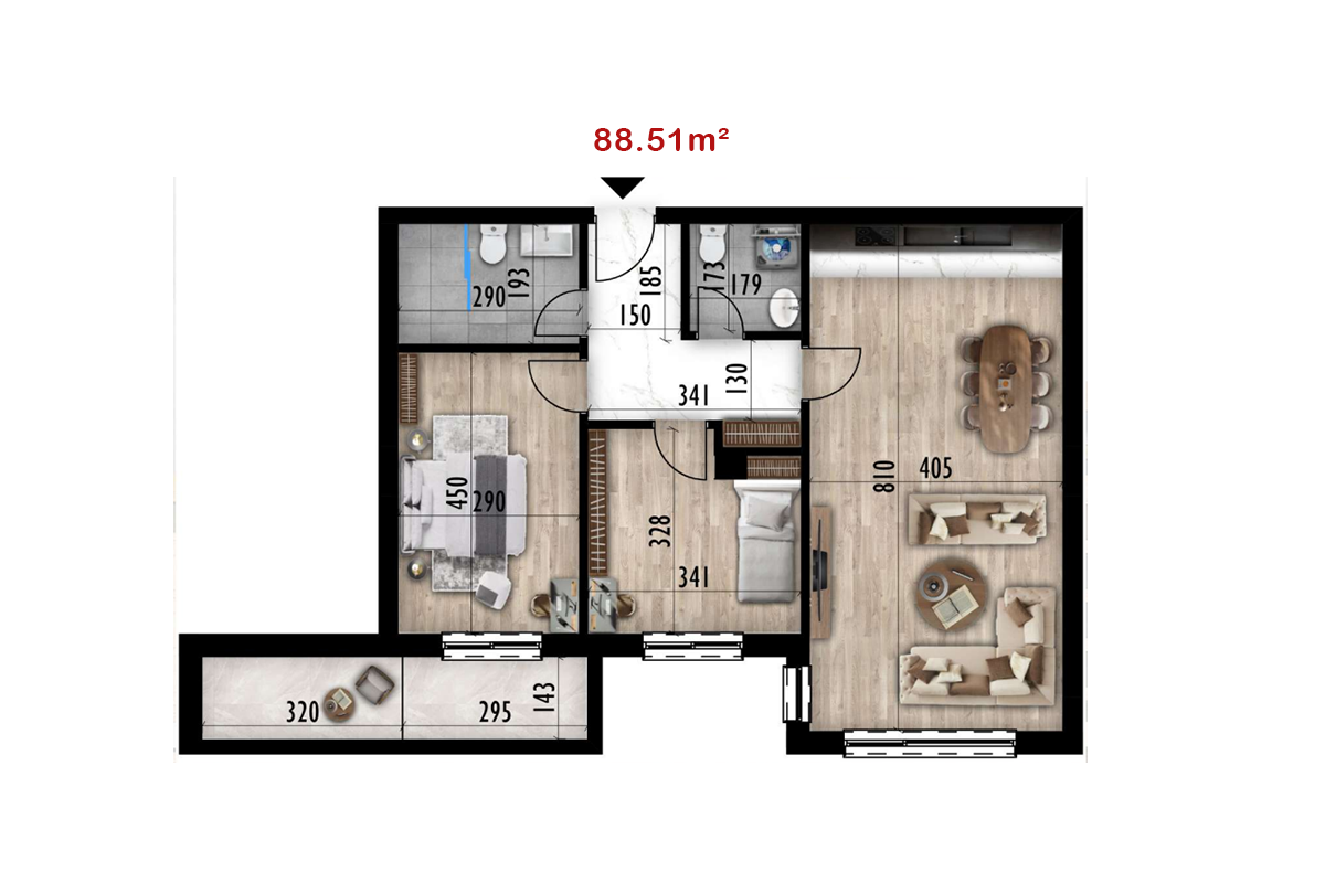 *Die Wohnung mit einer Wohnfläche von 88,51 m² hat eine Ausrichtung nach Westen und Süden und hat folgende Anordnung der Innenräume; Wohnzimmer, Küche mit Essbereich, zwei Schlafzimmer, Badezimmer, Toilette, Abstellraum und Balkon.