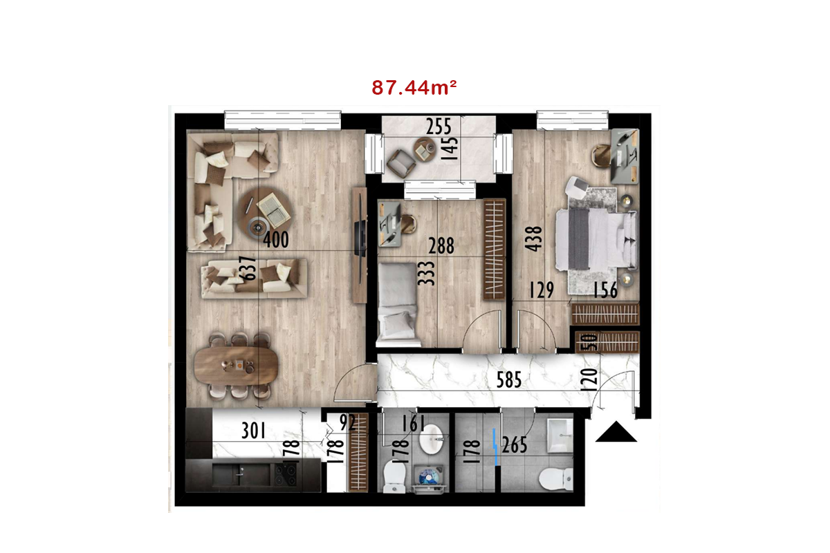 *Die Wohnung mit einer Wohnfläche von 87,44 m² hat eine Ausrichtung nach Osten und Norden und hat folgende Anordnung der Innenräume; Wohnzimmer, Küche mit Essbereich, zwei Schlafzimmer, Badezimmer, Toilette, Abstellraum und Balkon.