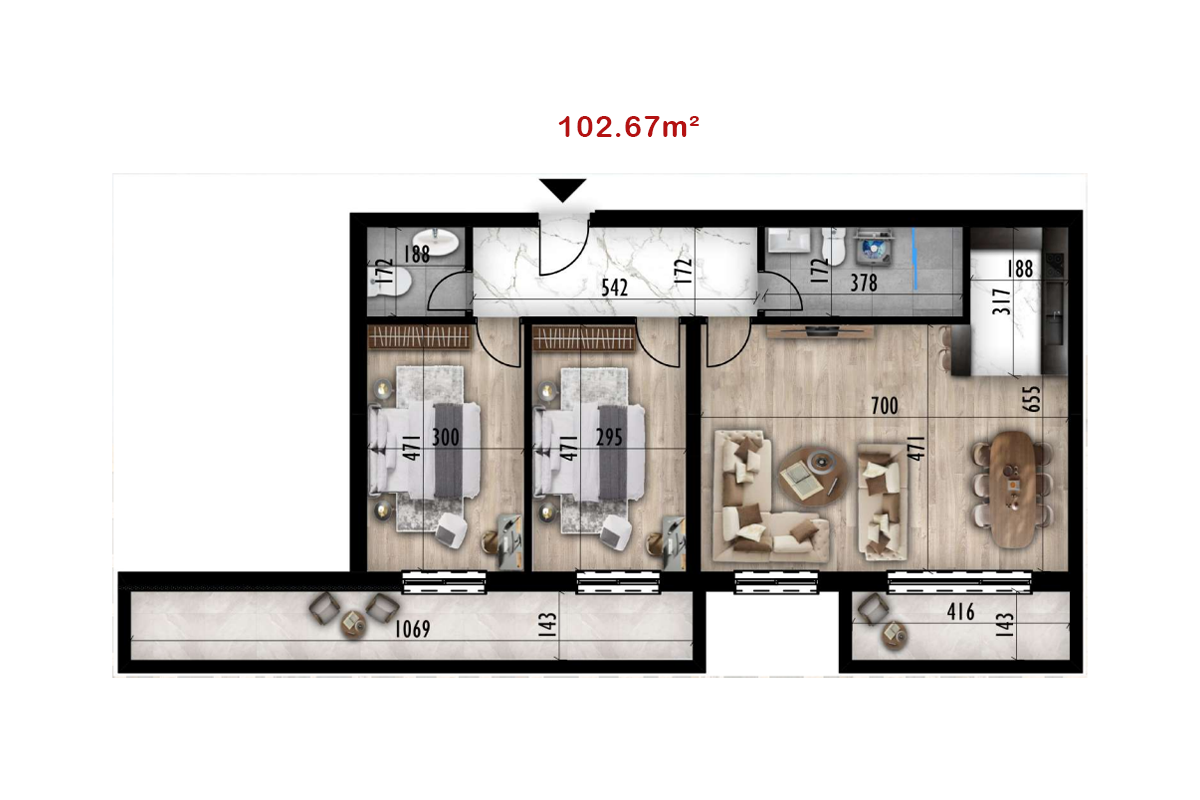 *Die Wohnung mit einer Wohnfläche von 102,67 m² hat eine Ausrichtung nach Westen und Süden und hat folgende Anordnung der Innenräume; Wohnzimmer, Küche mit Essbereich, zwei Schlafzimmer, Badezimmer, Toilette, Abstellraum und zwei Balkone.