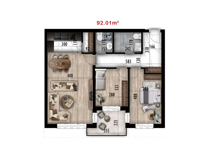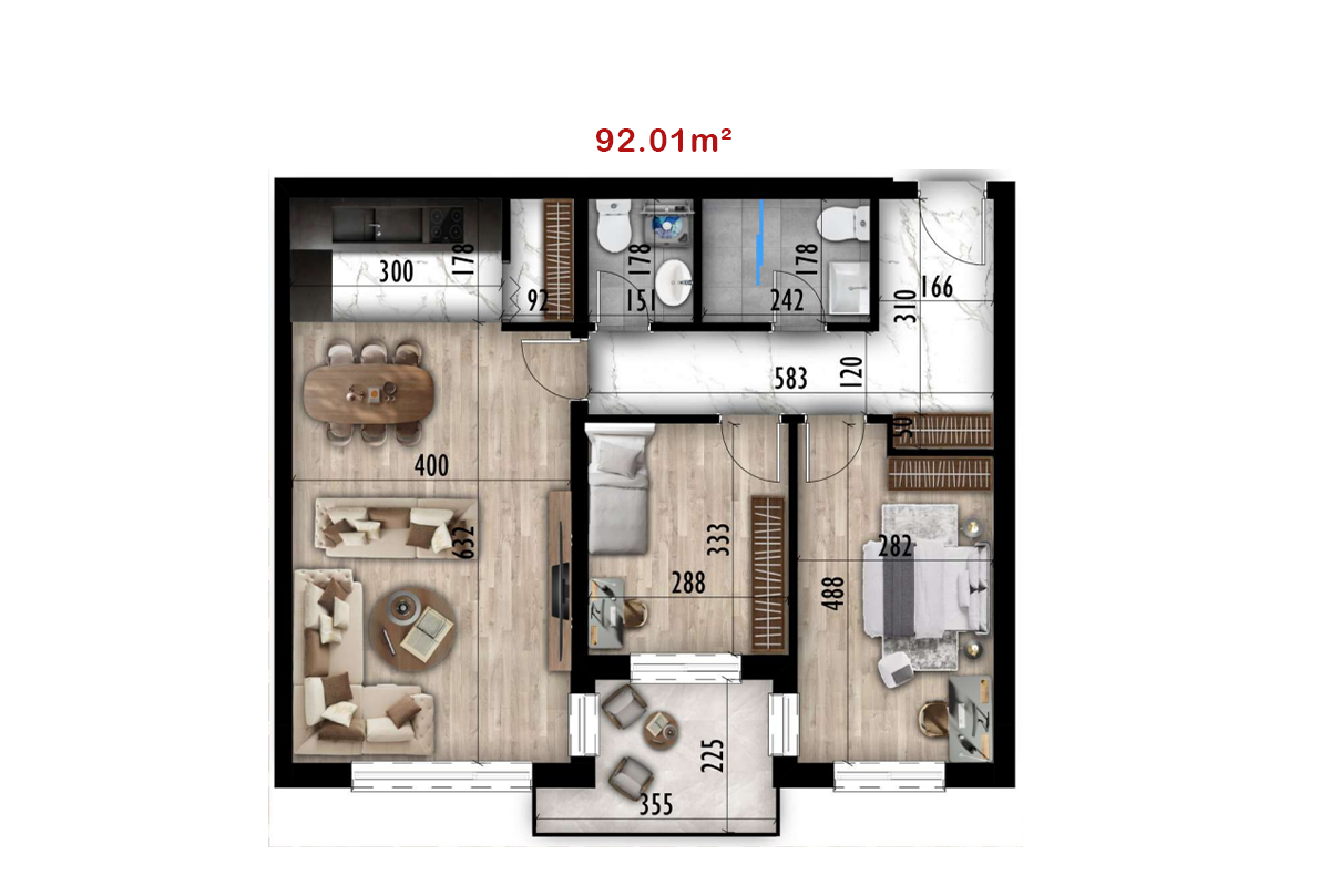 *Die Wohnung mit einer Wohnfläche von 92,01 m² hat eine Ausrichtung nach Westen und Süden und hat folgende Anordnung der Innenräume; Wohnzimmer, Küche mit Essbereich, zwei Schlafzimmer, Badezimmer, Toilette, Abstellraum und Balkon.