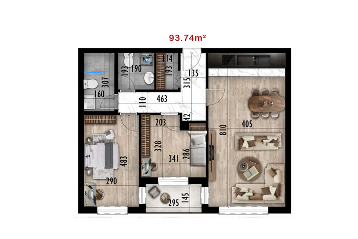 *Die Wohnung mit einer Wohnfläche von 93,74 m² hat eine Ausrichtung nach Westen und Süden und hat folgende Anordnung der Innenräume; Wohnzimmer, Küche mit Essbereich, zwei Schlafzimmer, Badezimmer, Toilette, Abstellraum und Balkon.