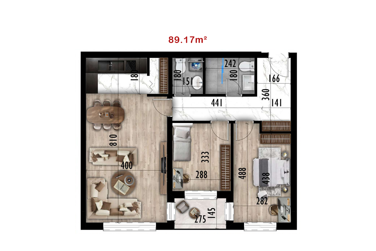 *Die Wohnung mit einer Wohnfläche von 89,17 m² hat eine Ausrichtung nach Westen und Süden und hat folgende Anordnung der Innenräume; Wohnzimmer, Küche mit Essbereich, zwei Schlafzimmer, Badezimmer, Toilette, Abstellraum und Balkon.