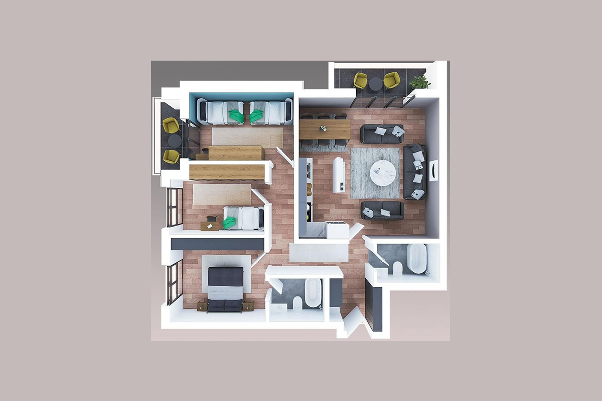 Die Wohnung hat eine Ausrichtung nach Osten und Westen mit folgender Anordnung der Innenräume: Wohnzimmer, Küche mit Essbereich, drei Schlafzimmer, zwei Badezimmer und Balkon.