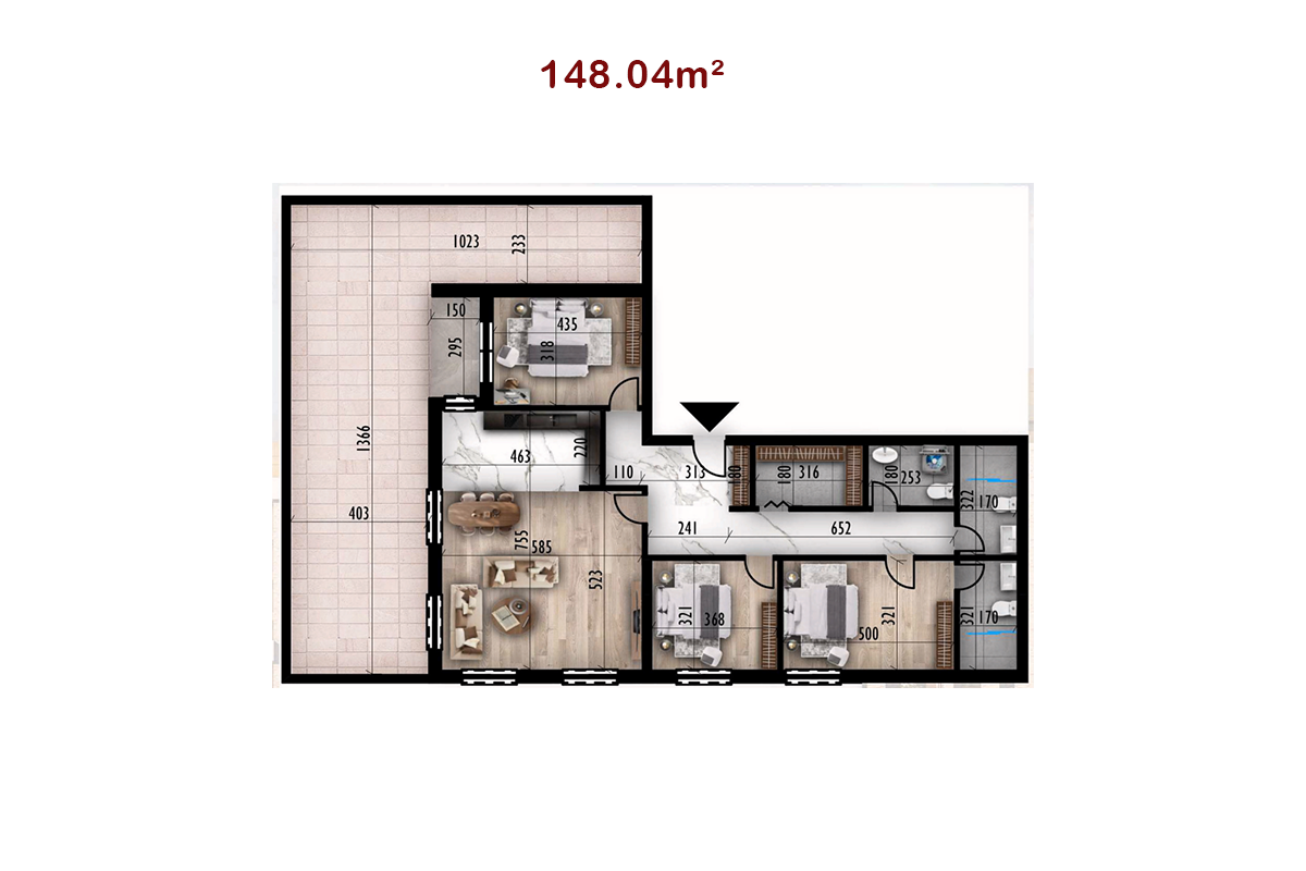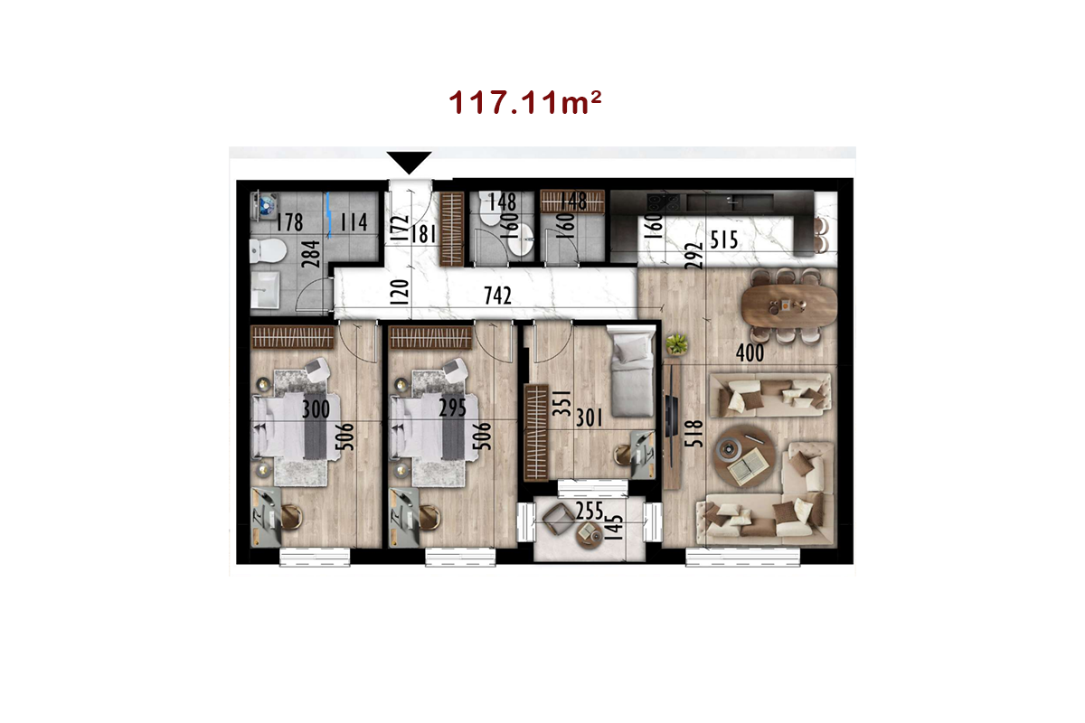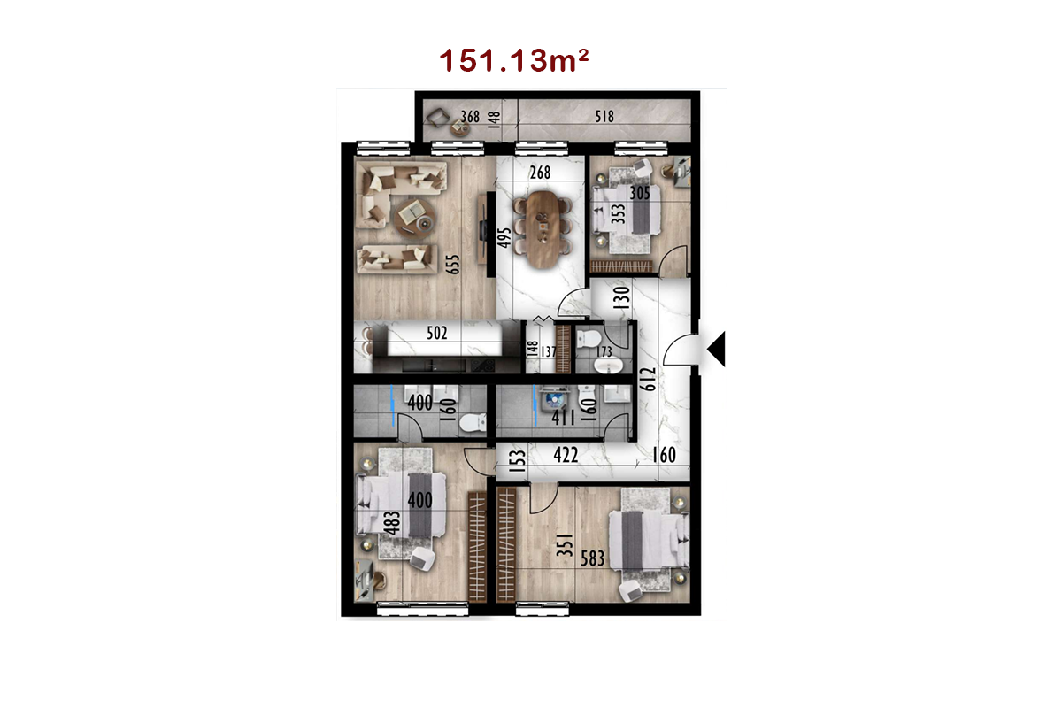 *Die Wohnung mit einer Wohnfläche von 151,13 m² hat eine Ausrichtung von allen Seiten und hat folgende Anordnung der Innenräume; Wohnzimmer, Küche mit Essbereich, drei Schlafzimmer, zwei Badezimmer, WC, Abstellraum und Balkon.